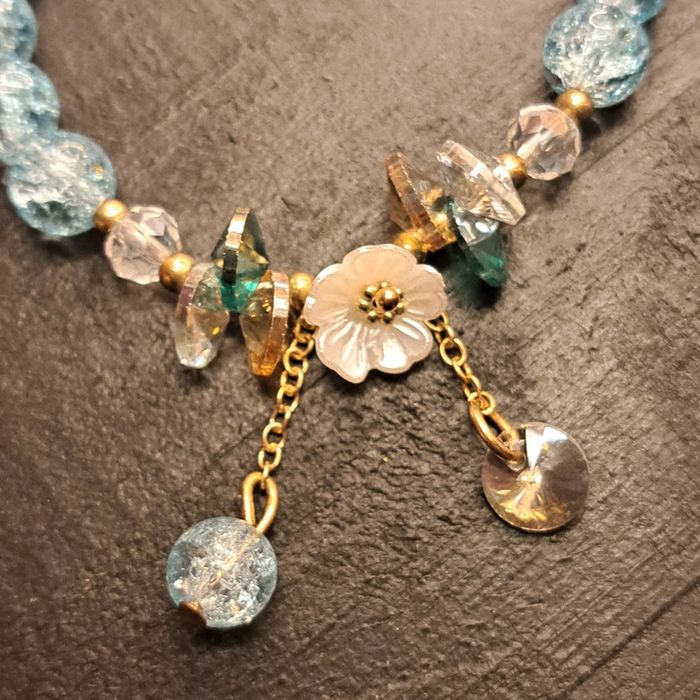 Bracelet style bohème bleu avec petite perles strass blanc transparent cristal et petite fleur blanche Très jolie et très féminin