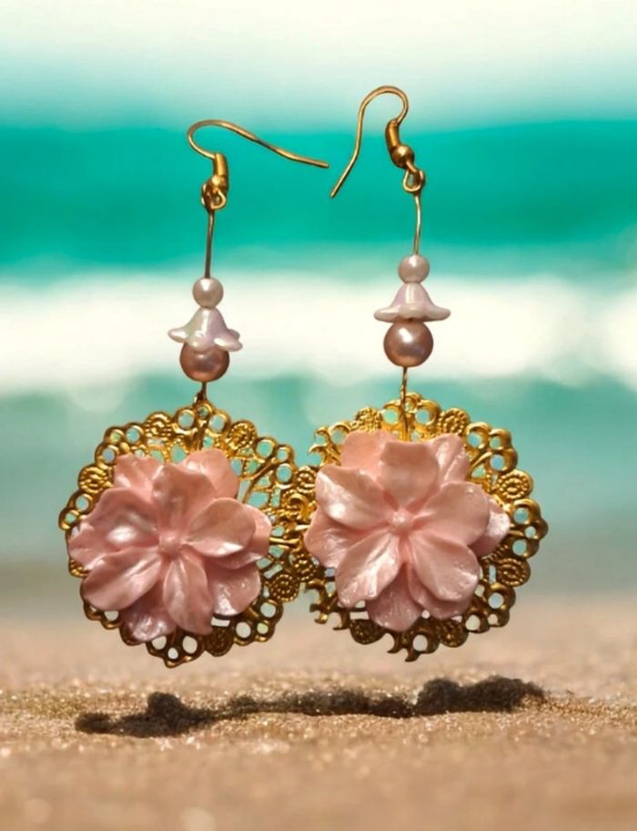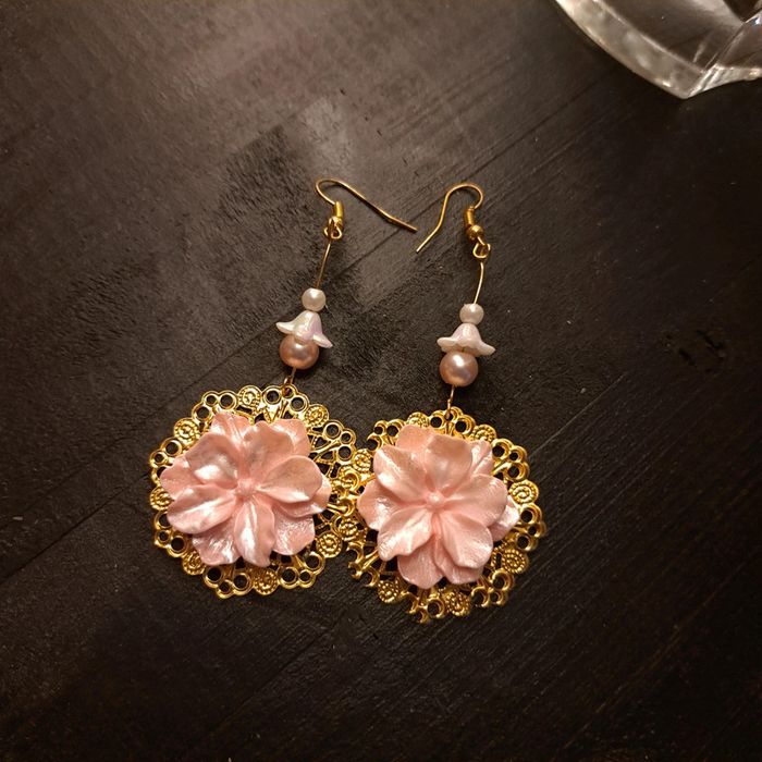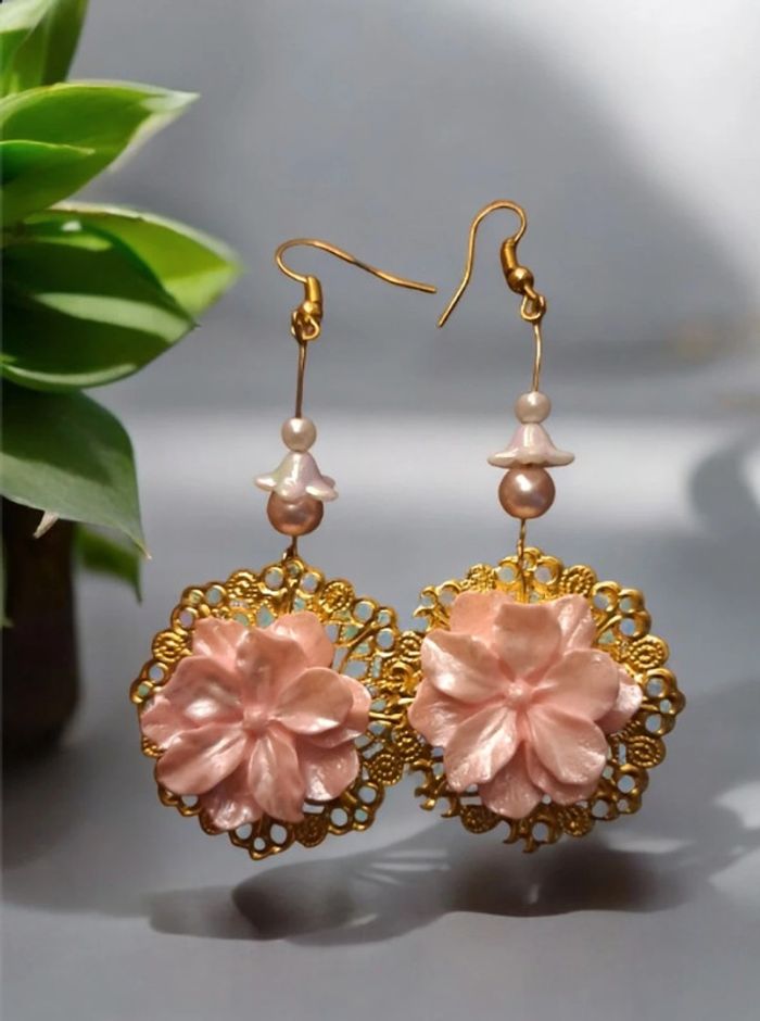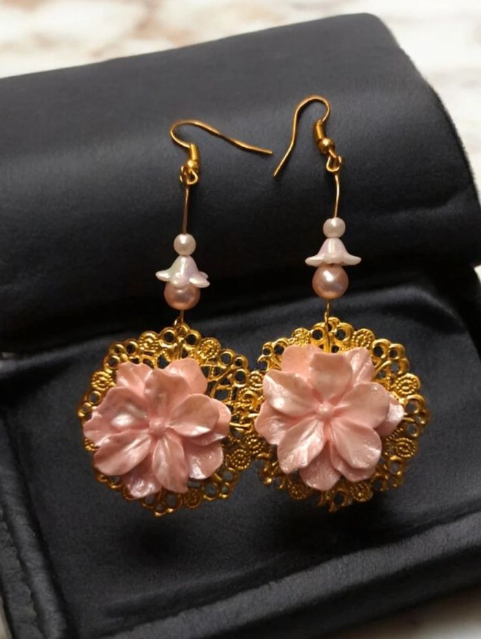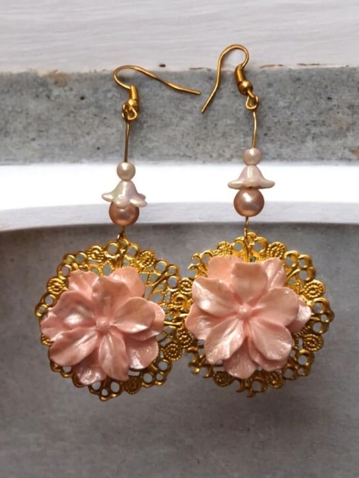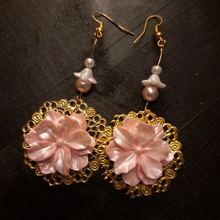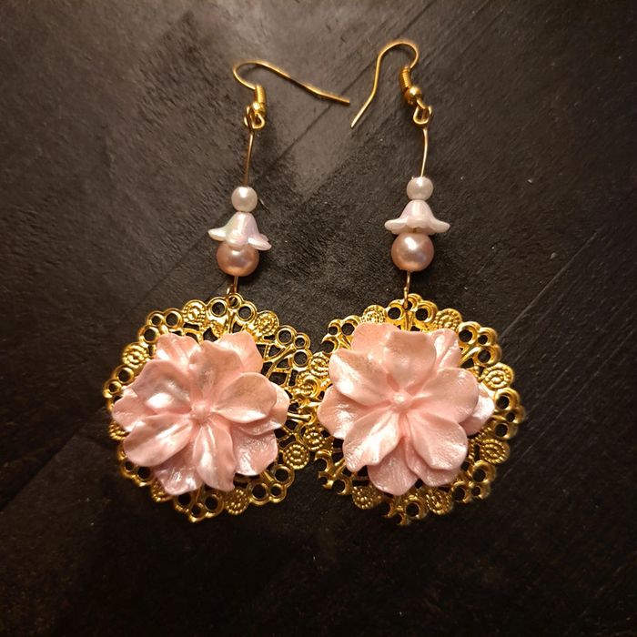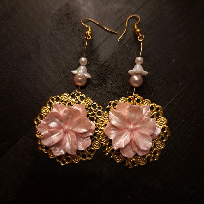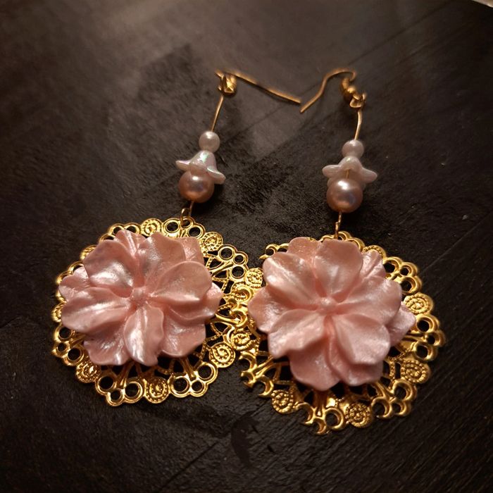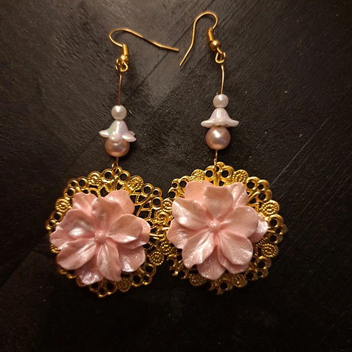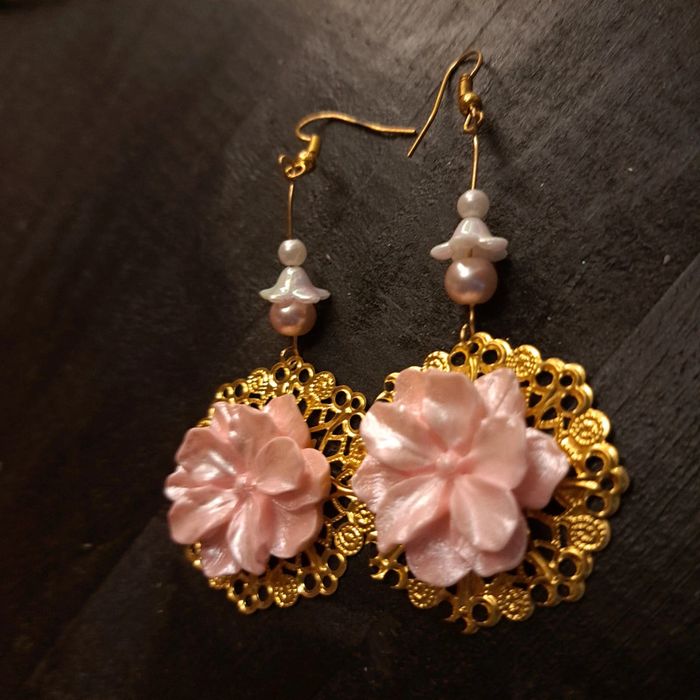 Magnifique paire de boucles d'oreilles pendante sur estampe doré impression dentelle avec fleurs rose pastel en relief Idéal pour une soirée pourquoi pas Noël ou un mariage bohème et champêtre