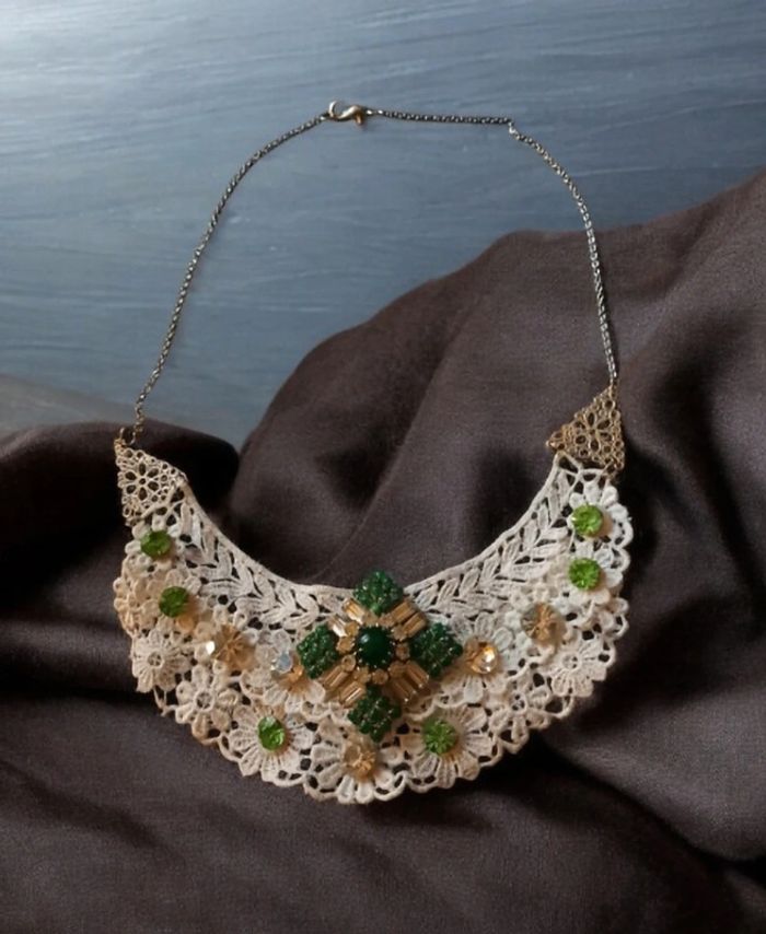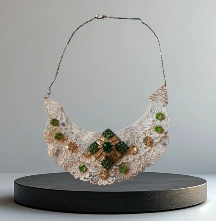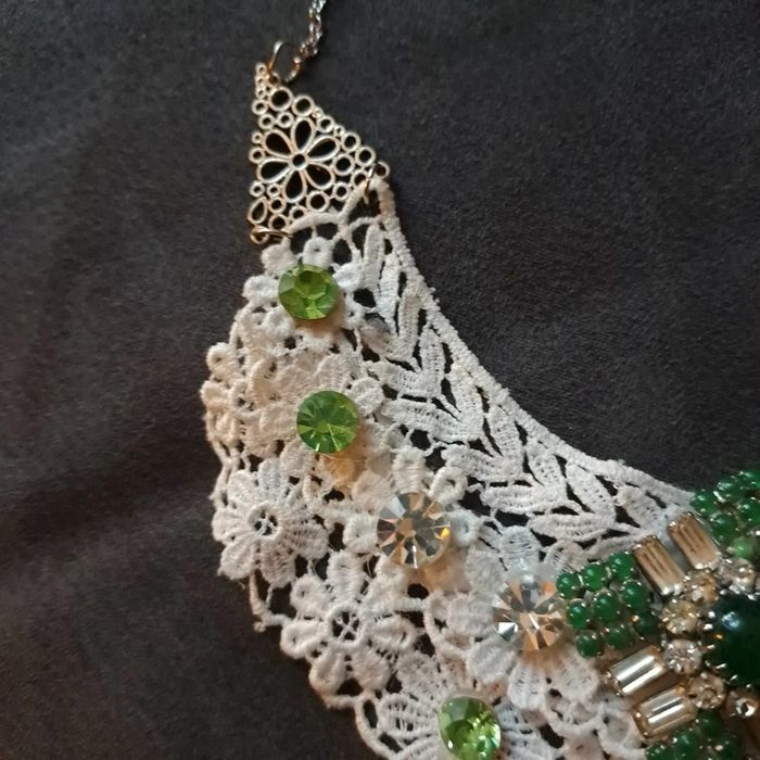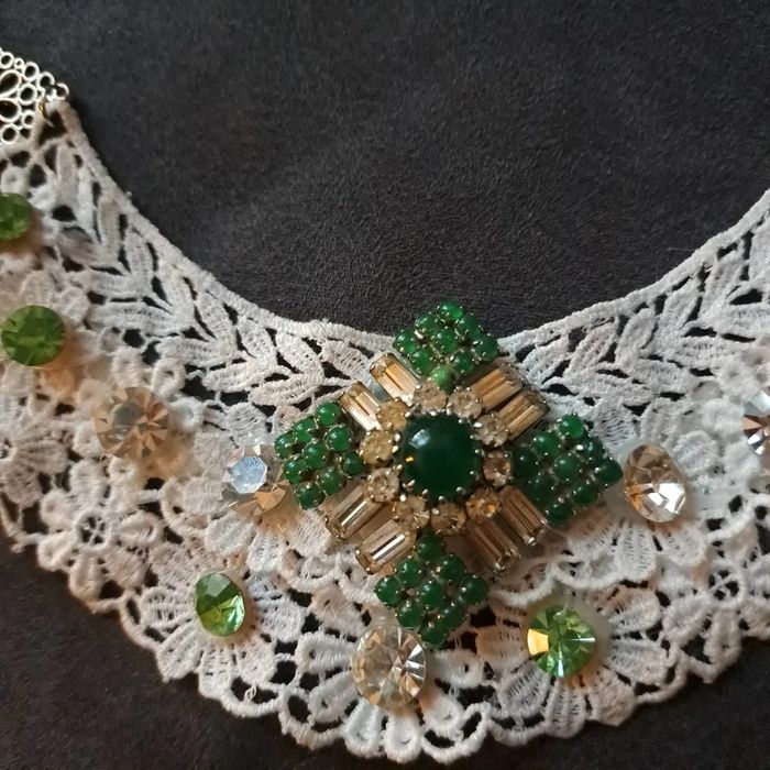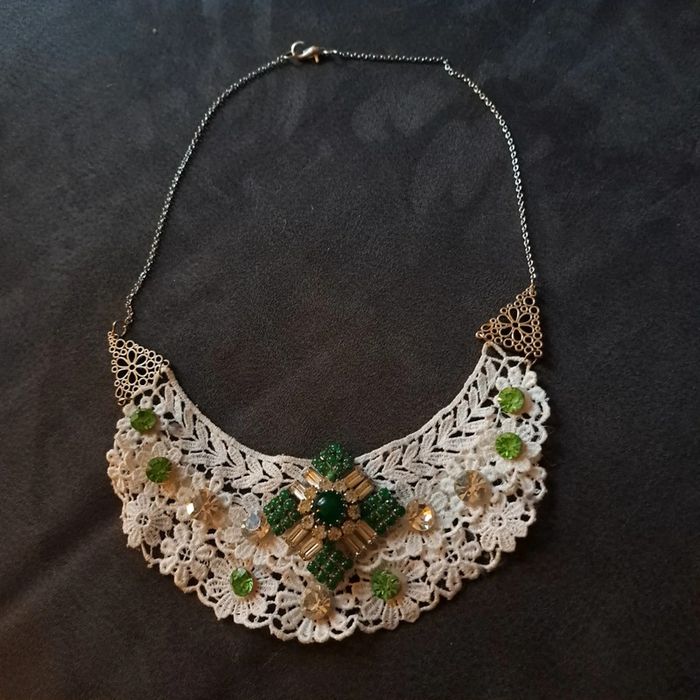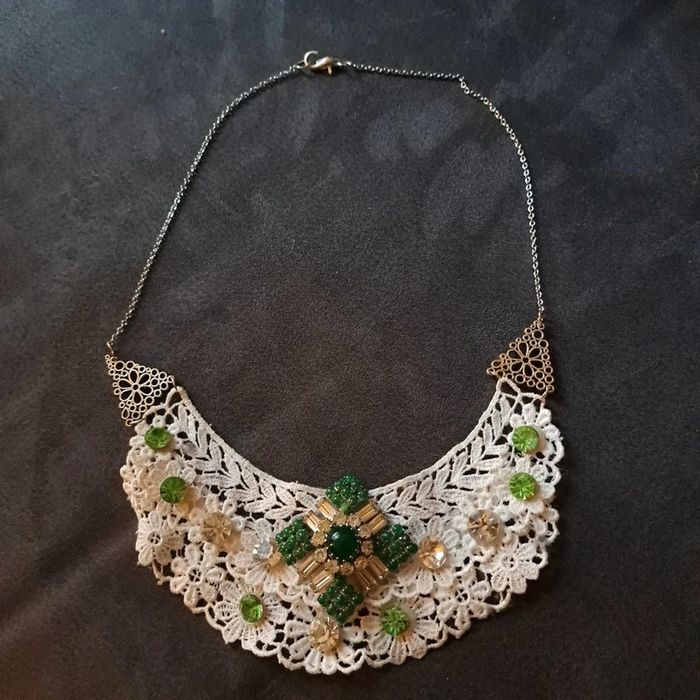Jolie collier plastron dentelle superposé blanche ajourée avec strass vert et blanc et Jolie pendentif strass vert Magnifique