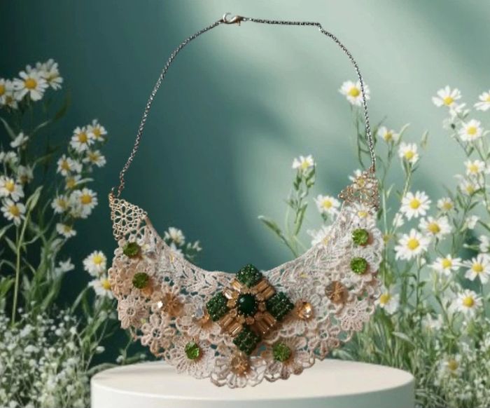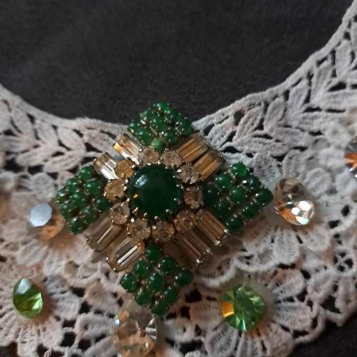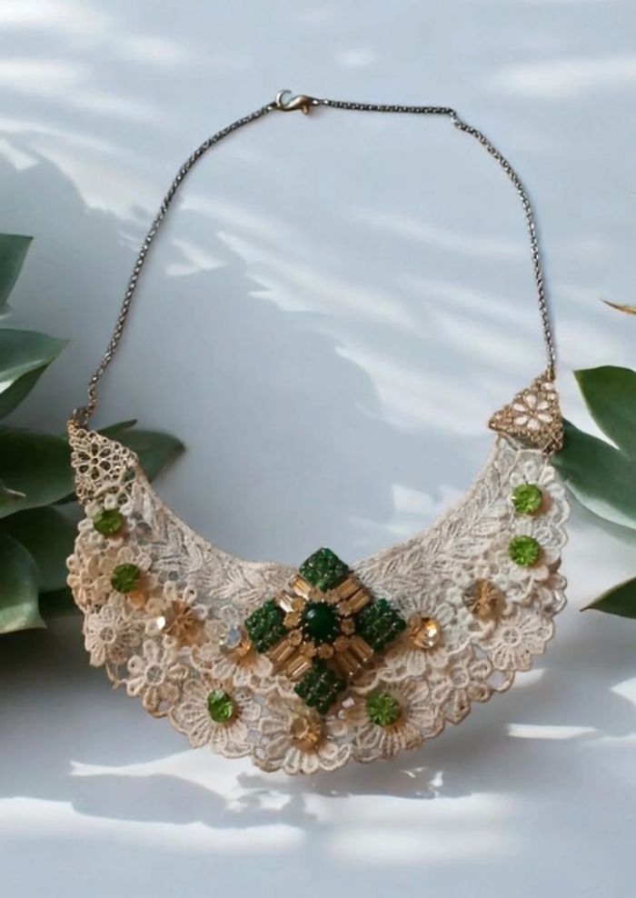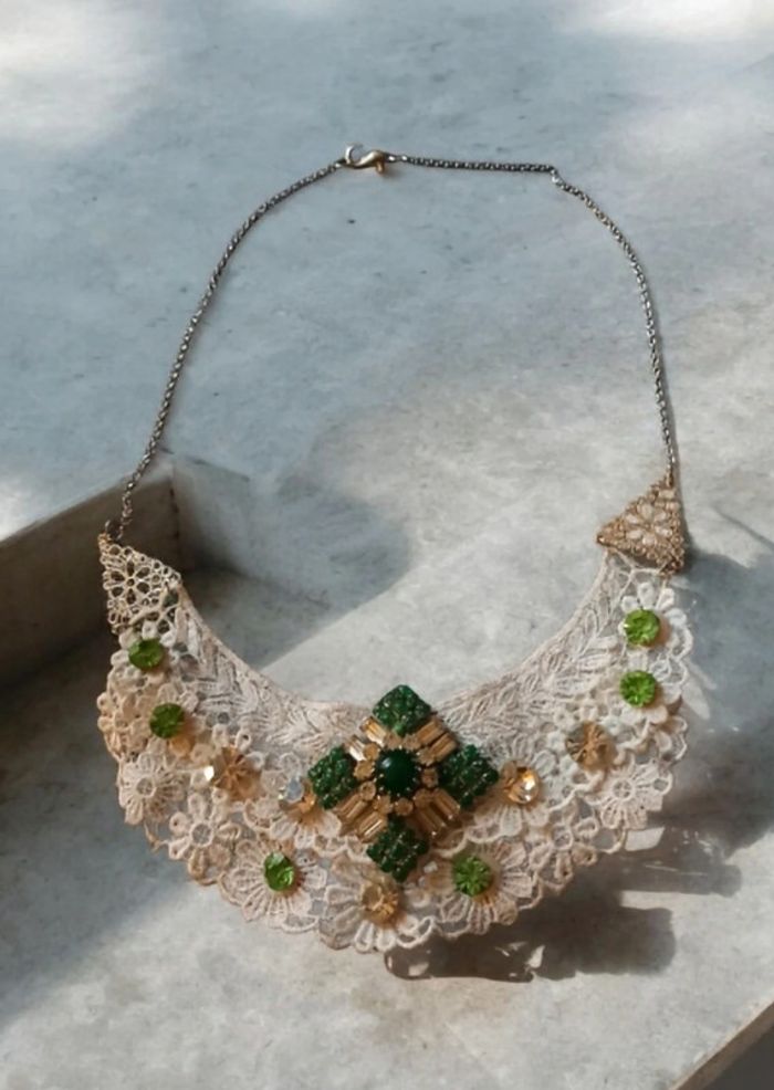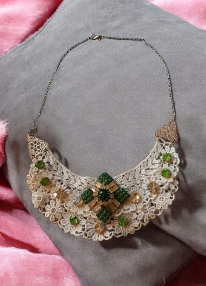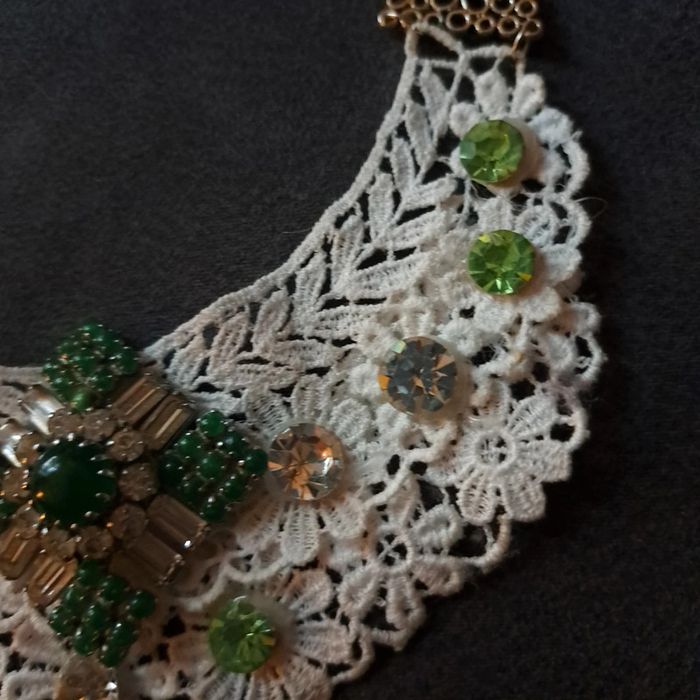 Jolie collier plastron dentelle superposé blanche ajourée avec strass vert et blanc et Jolie pendentif strass vert Magnifique