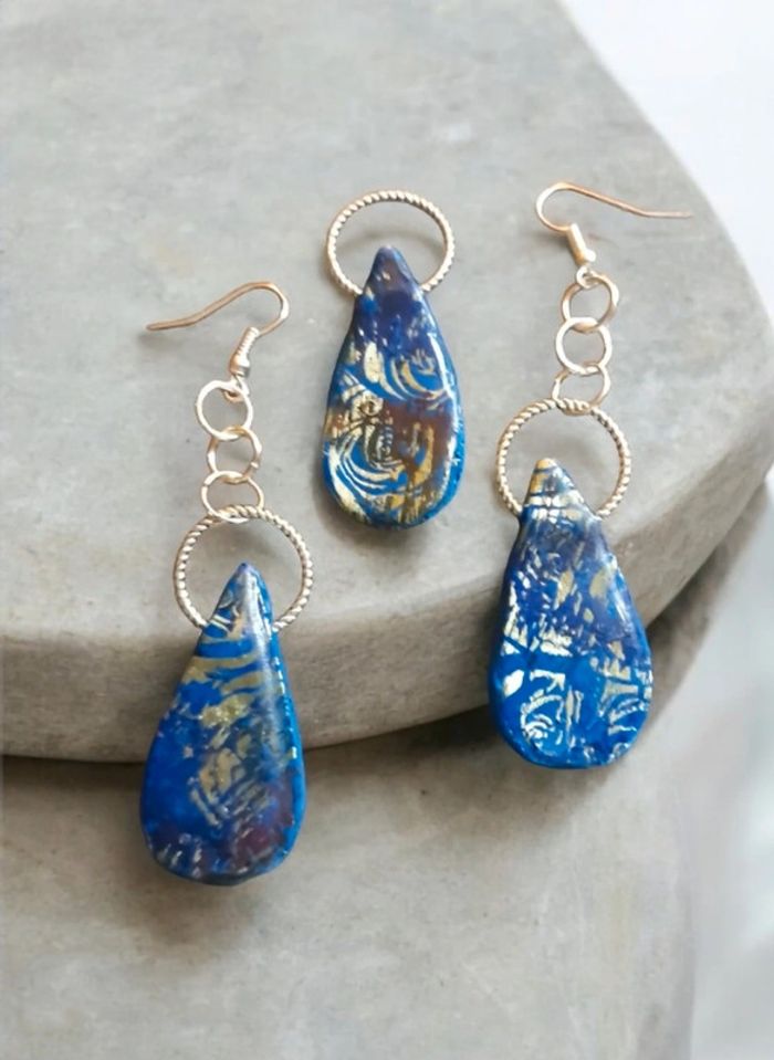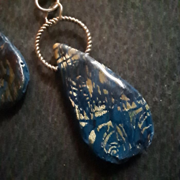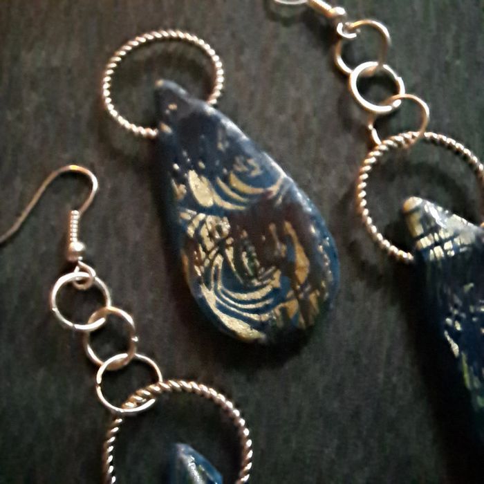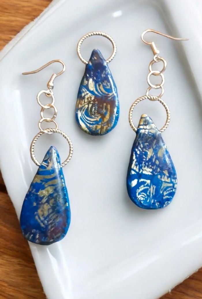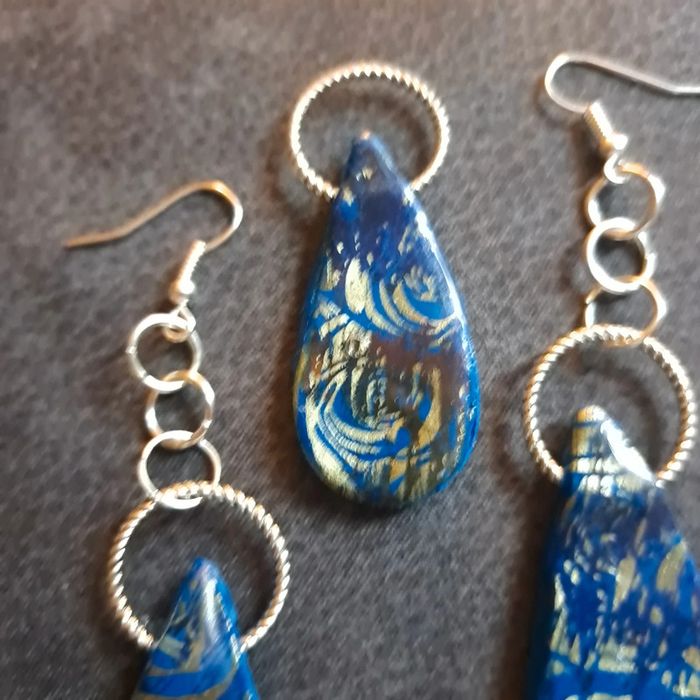 Boucles d'oreilles pendante avec pendentif assortie pâte polymere Bleu avec stickers arabesque doré finition résine Original et unique #boucles d'oreilles pendantes # boucles d'oreilles bleu et noir #boucles d'oreilles polymere #boucles d'oreilles fantaisies #boucledoreille # boucles d'oreilles Bohème #boutiqueindependante #bouclesdoreillespendantes #boucles d'oreilles résine #boucles d'oreilles multicolore