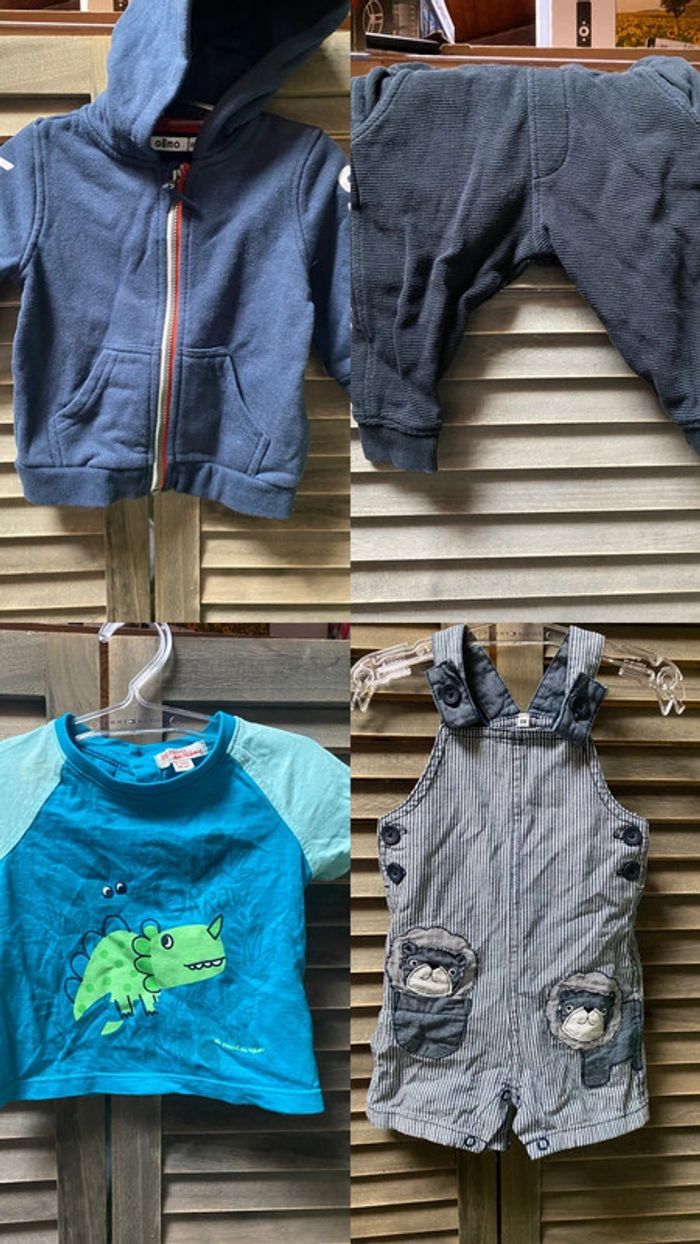 Lot de quatre, jolis vêtements, bébé garçon de taille 6 mois dont un en 3/6mois Il y a une veste un jogging une salopette et un T-shirt dinosaure ils sont en parfait état