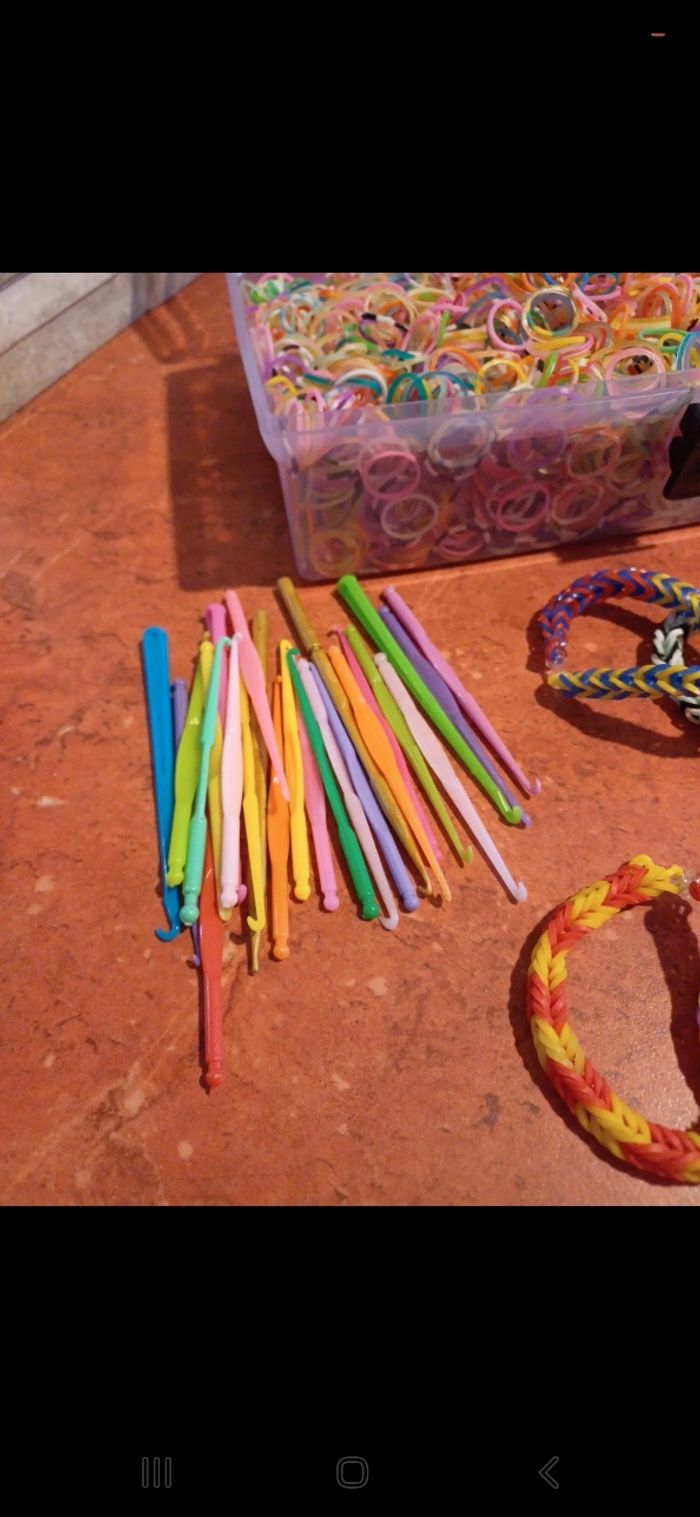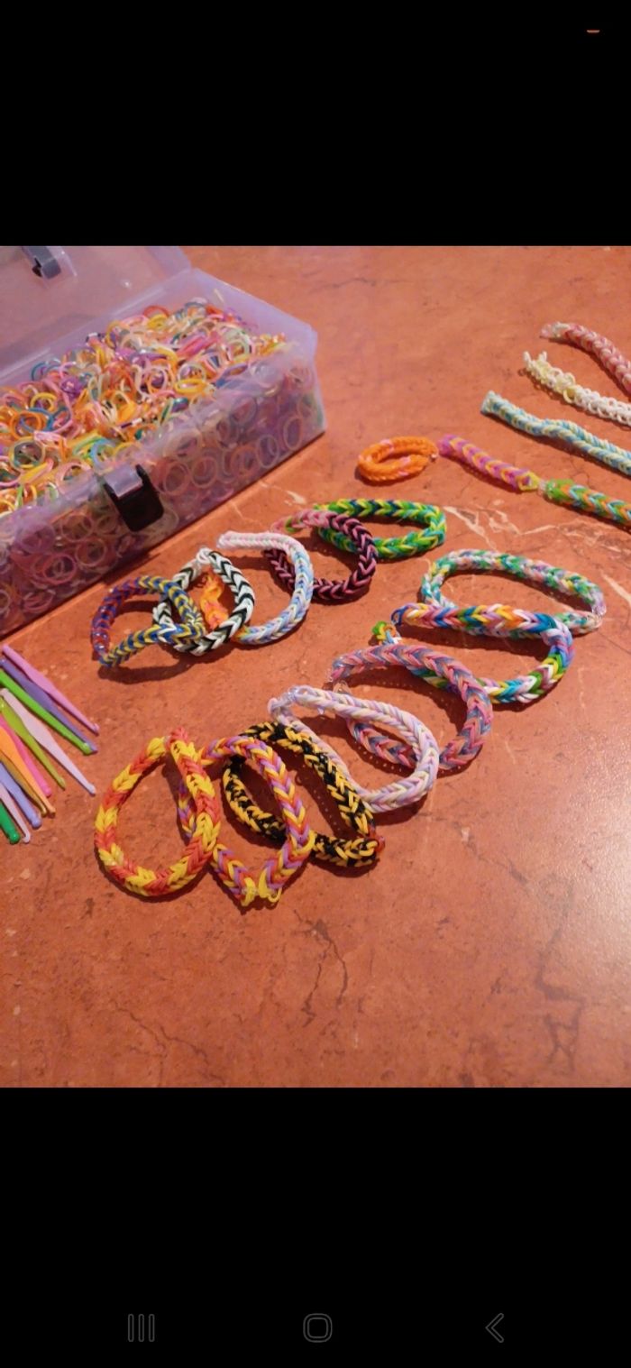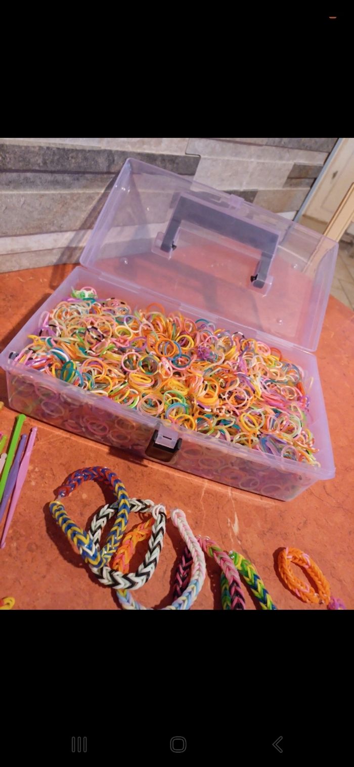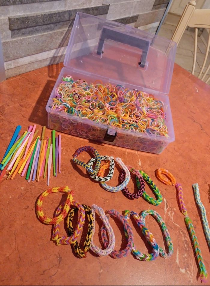 Kit comprenant énormément d elastiques, des attaches, des crochets, bracelets faits et en cours. Avec boîte pour ranger le tout.