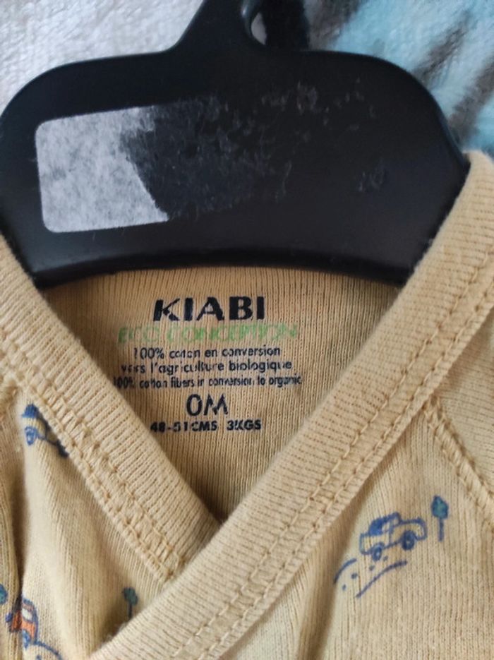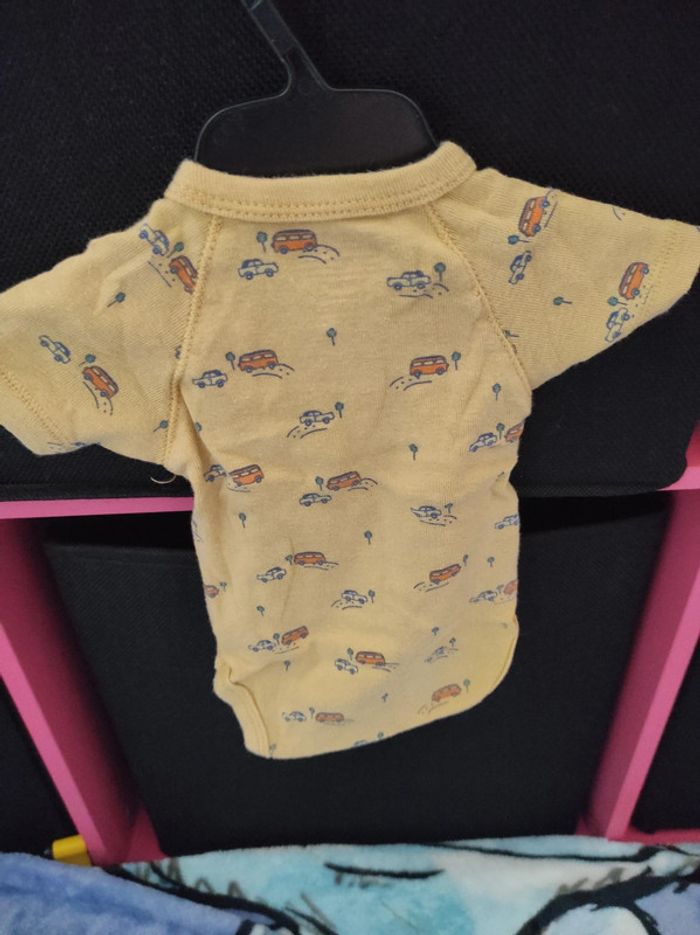 Body jaune sable à manches courtes avec de petites voitures en très bon état. Fermeture sur le devant. Marque: Kiabi Taille: 0 mois C.C