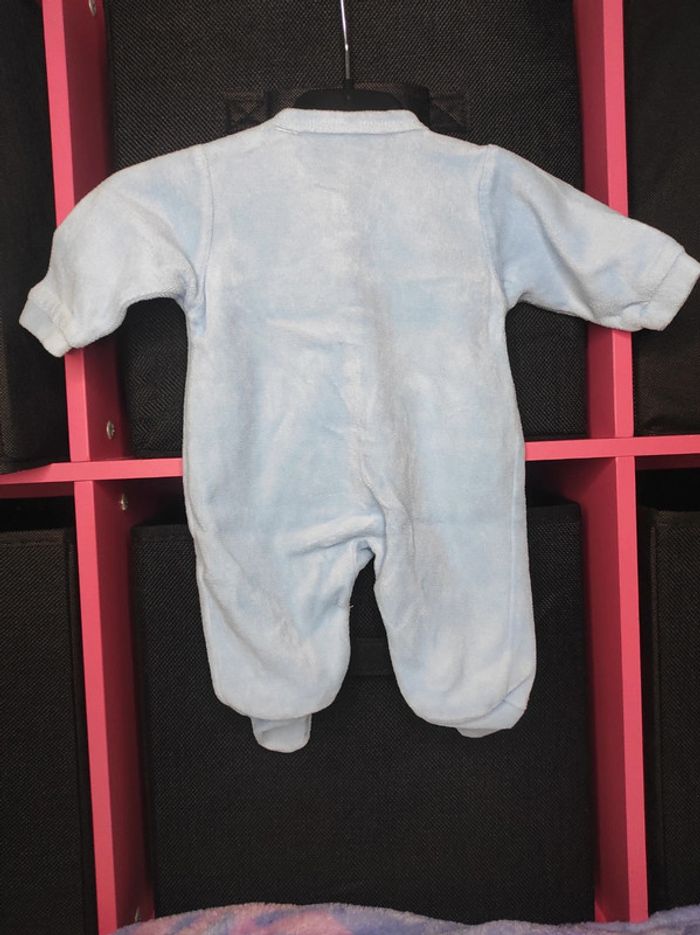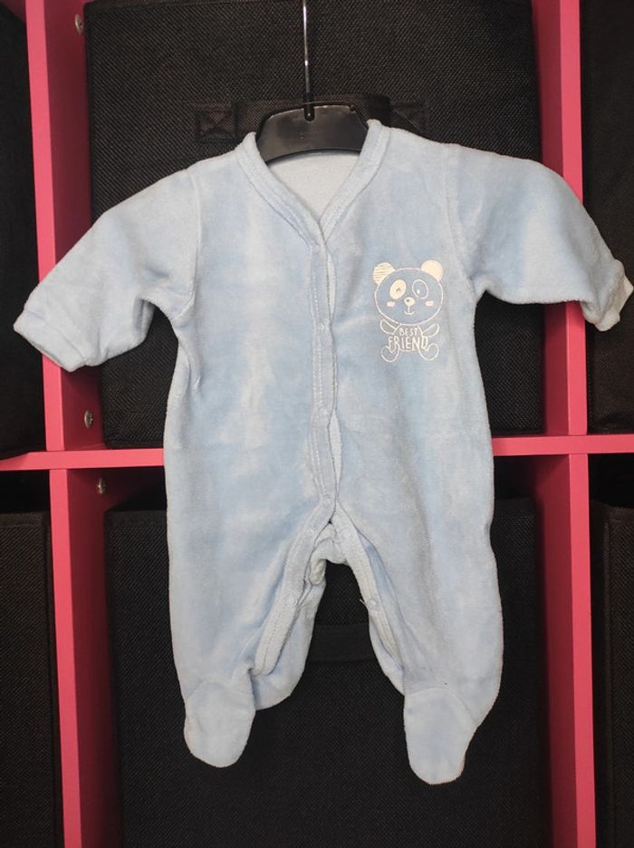 Pyjama épais bleu clair en bon état avec un petit ourson "best Friend". Fermeture sur le devant. Taille: naissance C.C