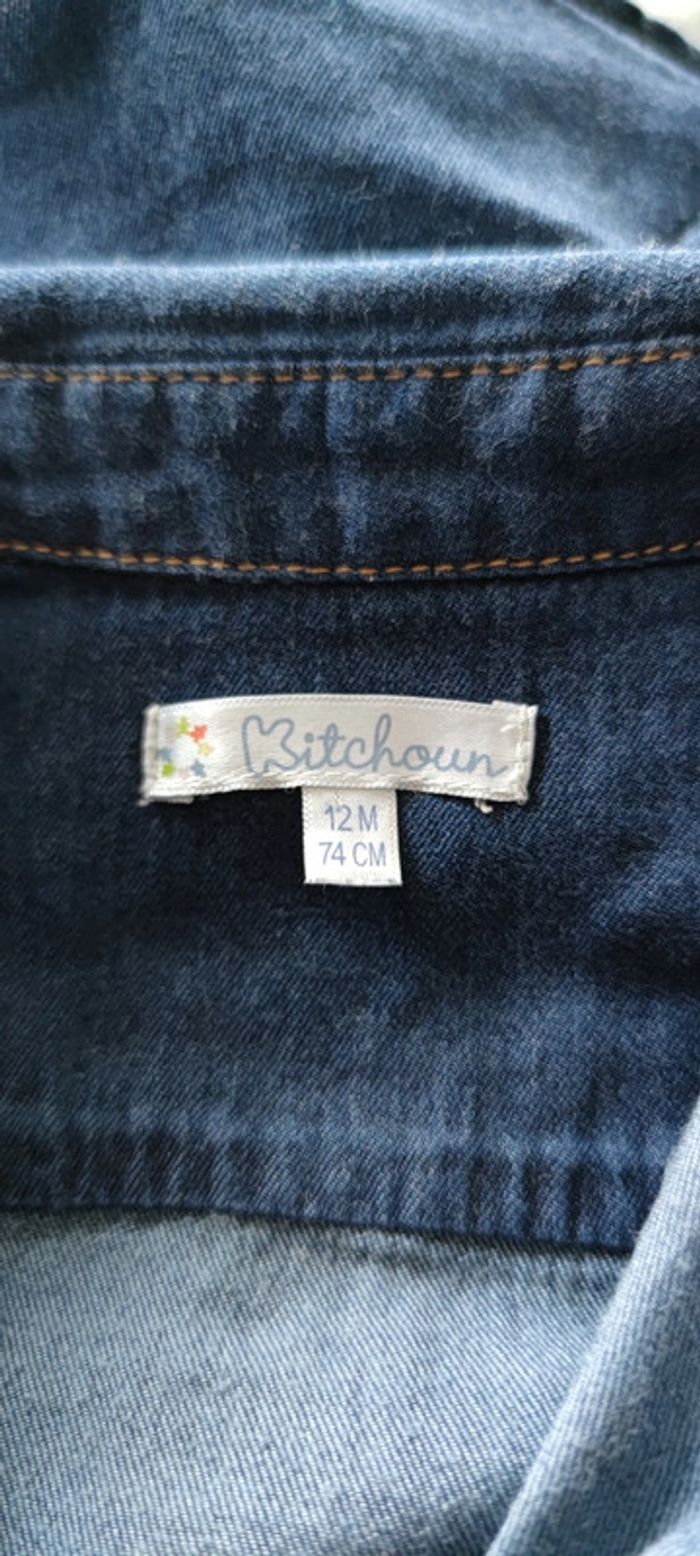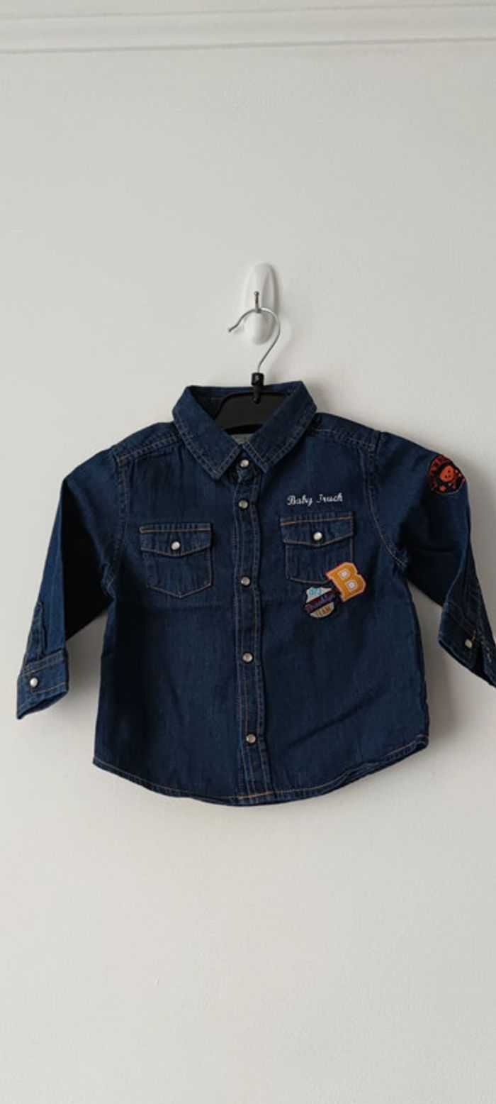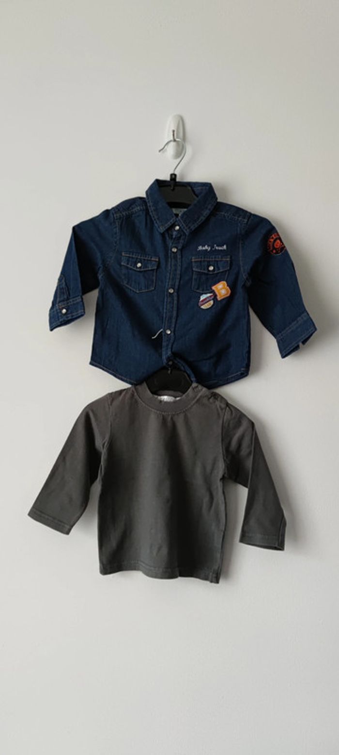 Lot chemise manches longues en jean bleu marine, ouverture boutons pression + tee-shirt gris manches longues - T. 12 mois. * TRES BON ETAT *
