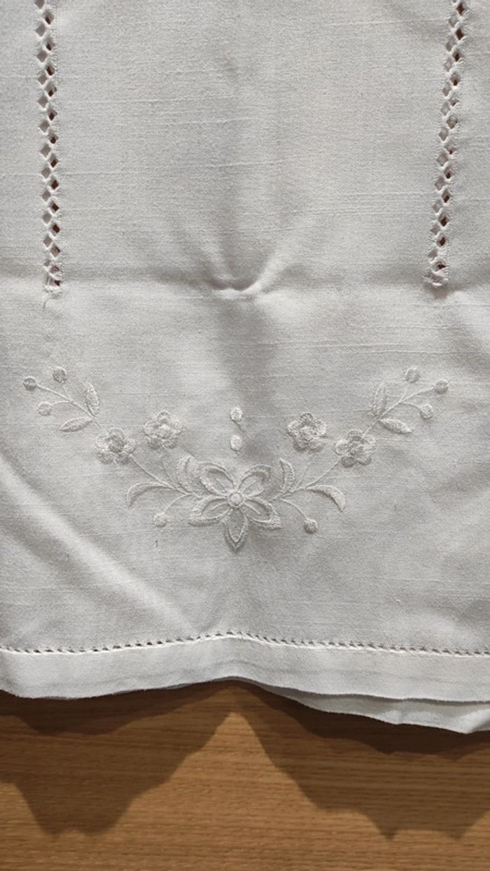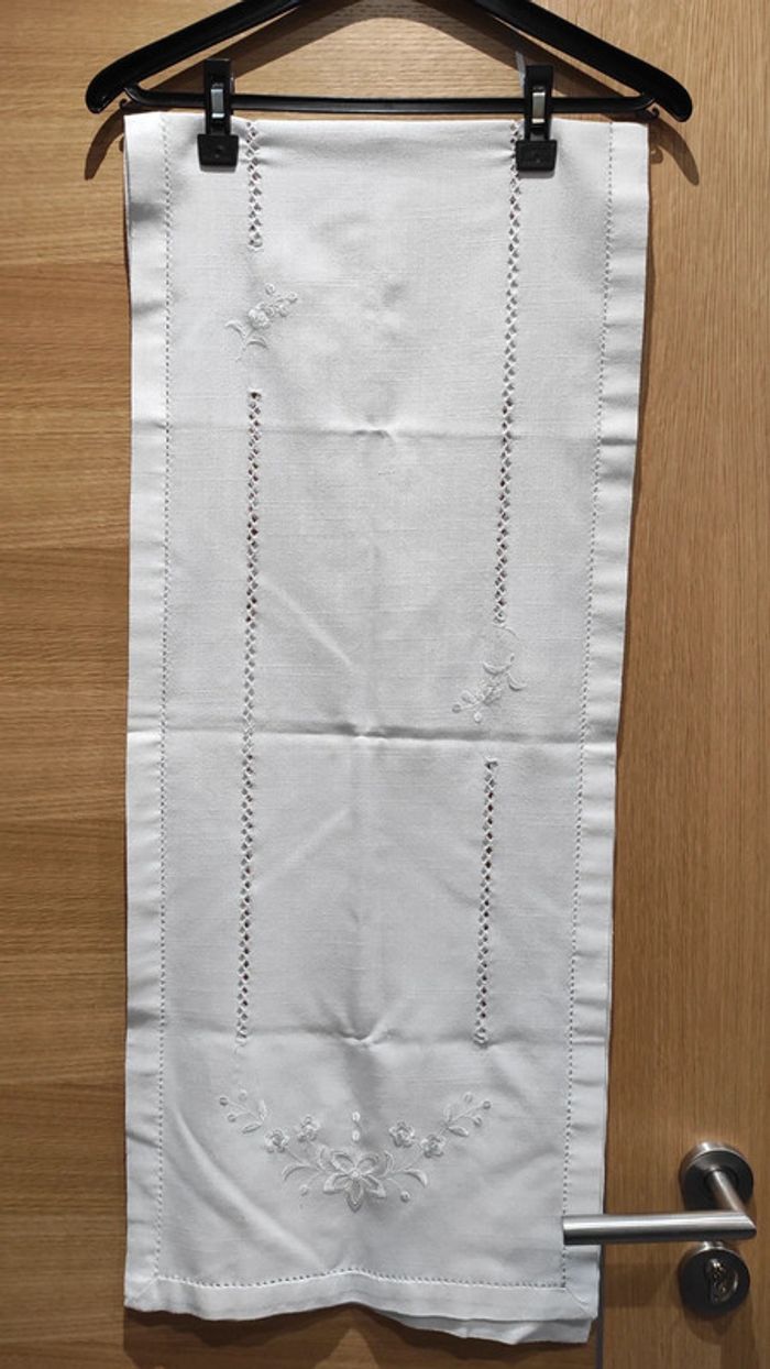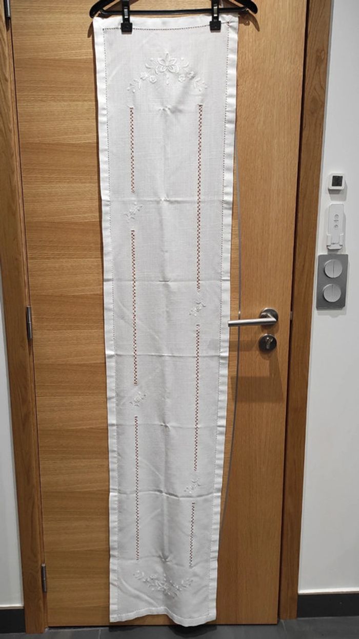 Napperon rectangulaire, 175x36cm. Blanc, fleurs brodées.