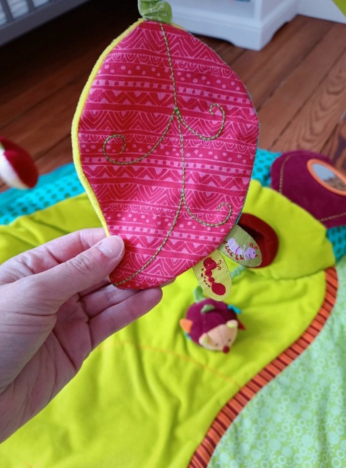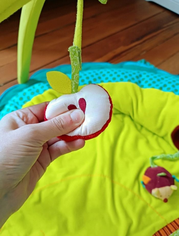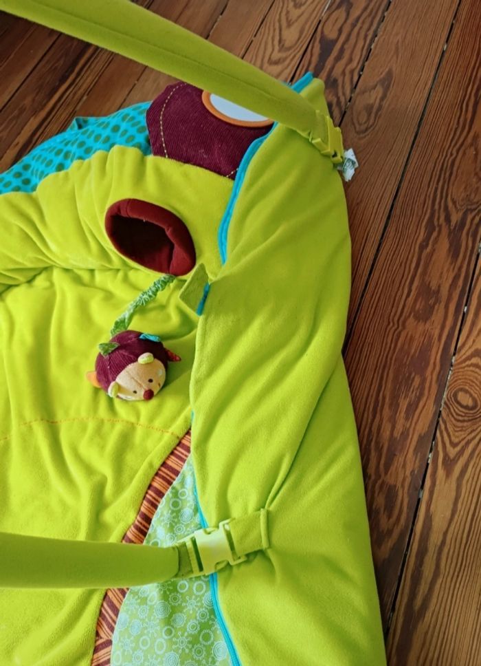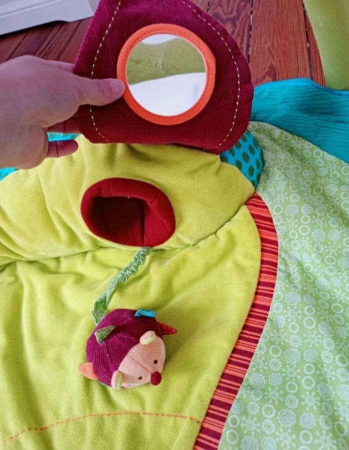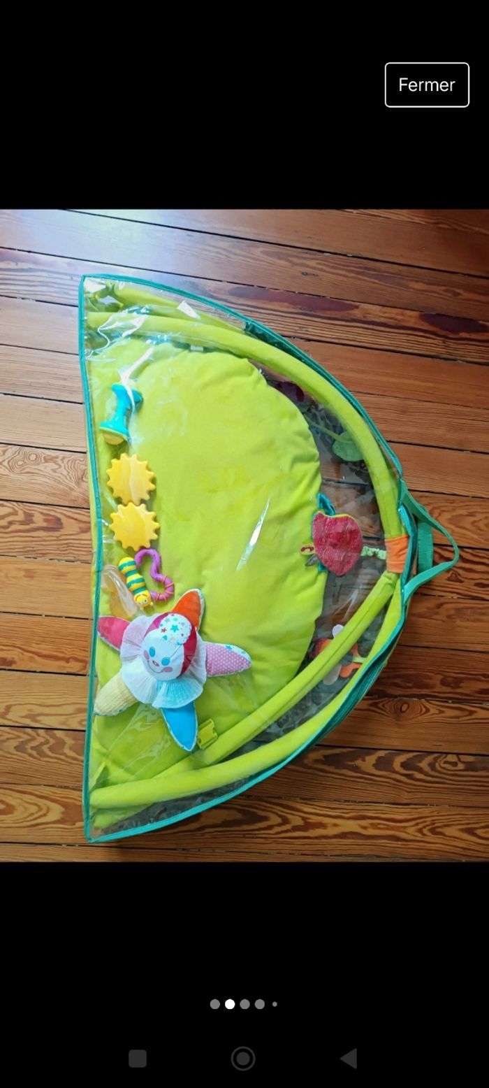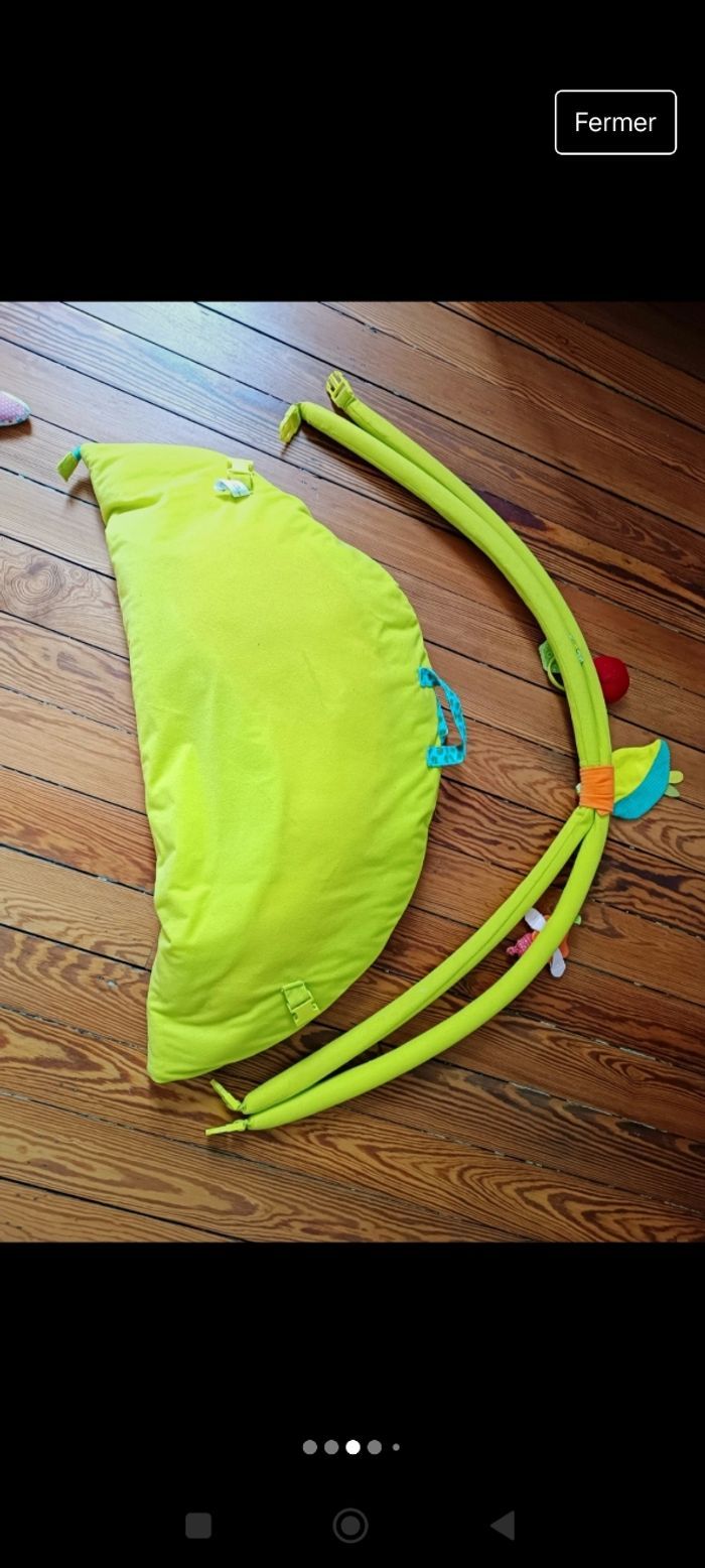 Super tapis d'éveil transportable de la marque Lilliputiens. Très pratique il se plie, se ferme par zip, les arches se démontent facilement par clips et le tout est transportable dans sa housse. Tapis en forme de feuille, aux couleurs vives, aux textures variées et aux empiècements en velours pour l'éveil sensoriel de Bébé Coussin cale-tête intégré Arche avec des petits jouets suspendus qui s'attachent à l'arche par velcro : 1 petit hochet abeille machouillable + 1 petite pomme " pouet-pouet + " 1 feuille qui crisse et sur le tapis un petit hérisson qui se cache dans un trou et 1 feuille qui dissimule un petit miroir Le tapis est impeccable, en parfait état de propreté, il passe facilement en machine. Seul défaut : l'une des 2 arches est cassée au sommet mais non visible et n'empêche pas le maintien correct de l'ensemble comme le montrent les photos Tapis acheté 99,90€ Je joins au tapis un lot de petits jouets d'éveil 1er âge pour stimuler les sens de bébé : 1 système de petits engrenages plastiques qui coulissent quand on les manipule + 1 hochet grelot à forme ergonomique pour la petite main de bébé + 1 hochet papillon à machouiller et qu'on peut mettre au congélateur + 1 pieuvre aux différentes textures