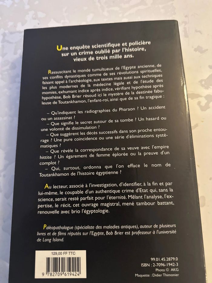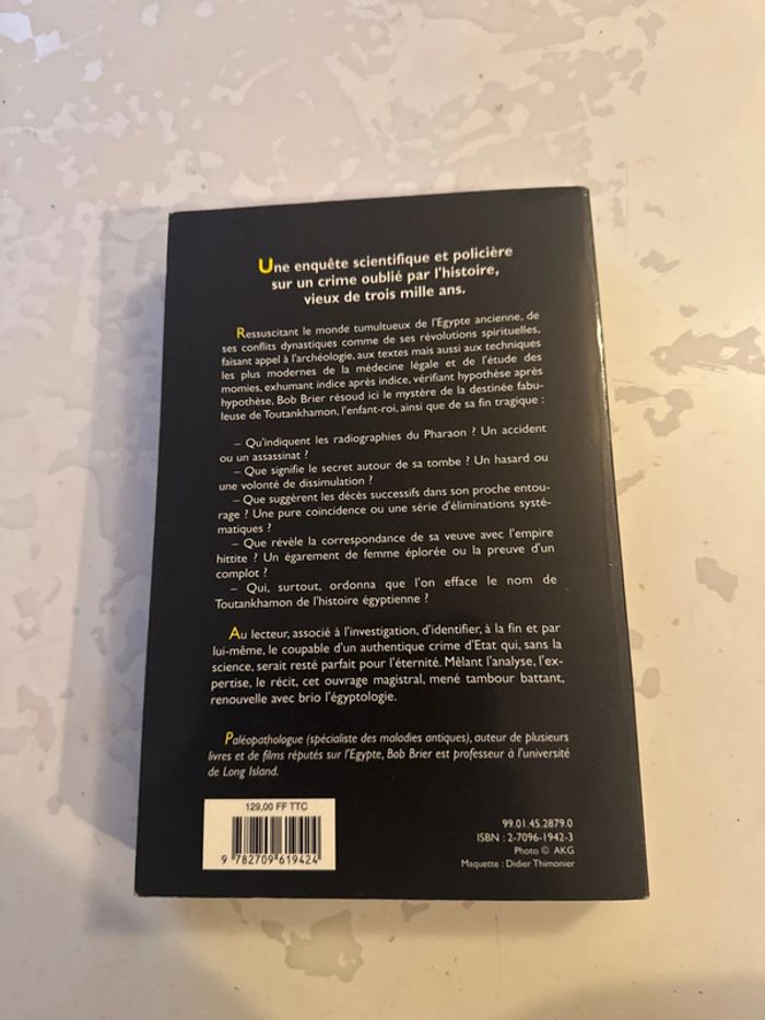 Vend Livre le meurtre de toutankhamon - bob brier Une petite déchirure sur la page de couverture (voir photo) Sinon livre en bon état