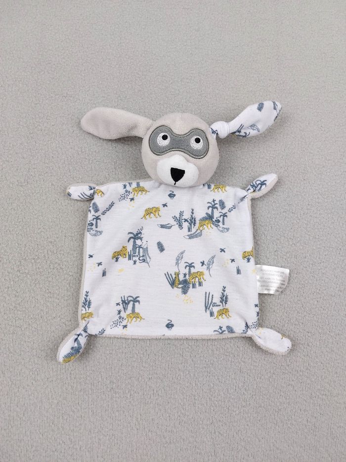 Doudou plat lapin chien gris masque gris blanc jaune savane tigres IKKS Berdoues Très bon état, lavé avant la vente Envoi rapide Réf A10635
