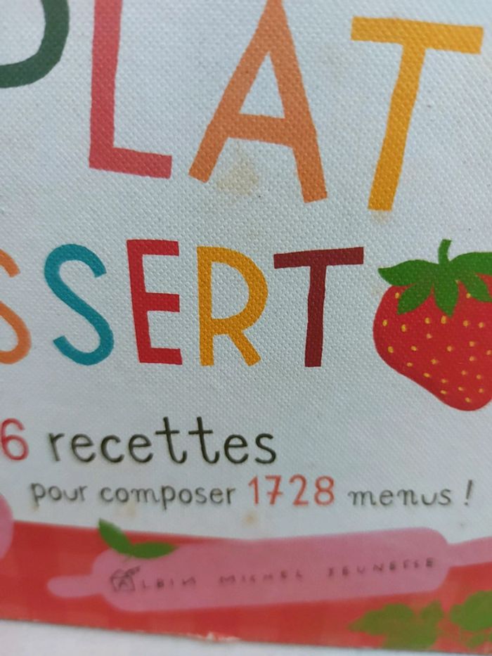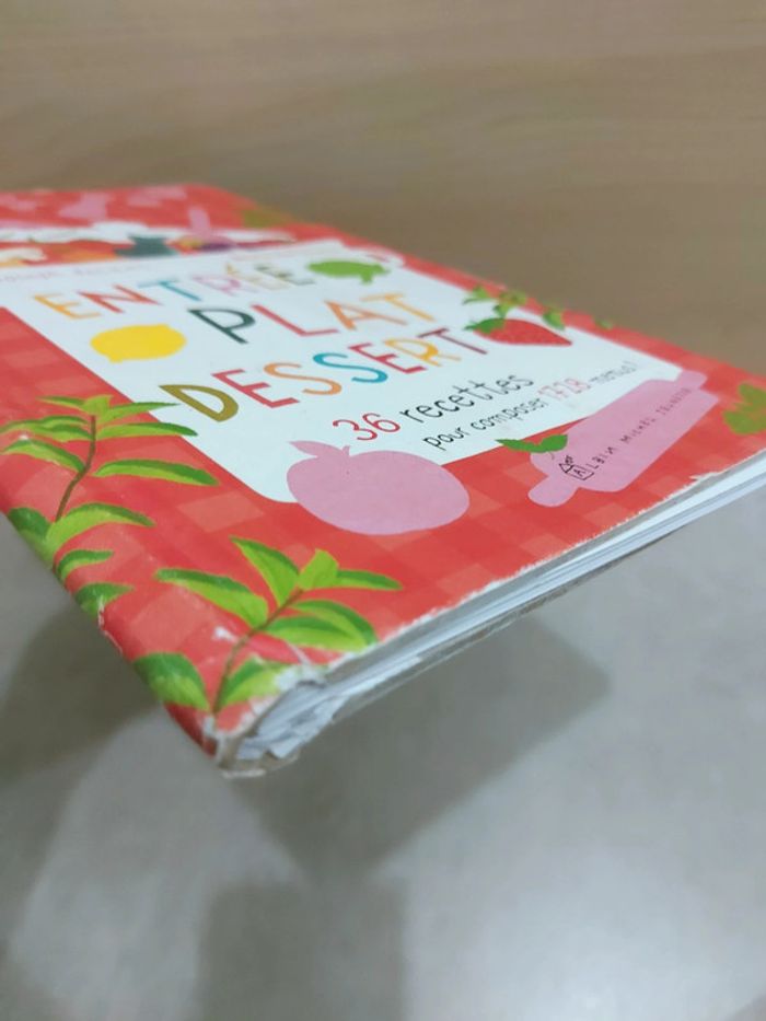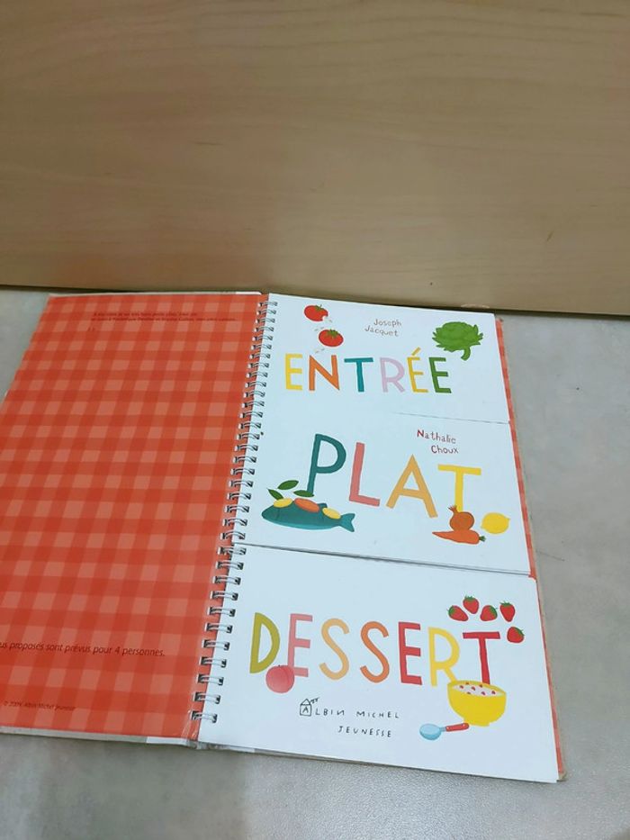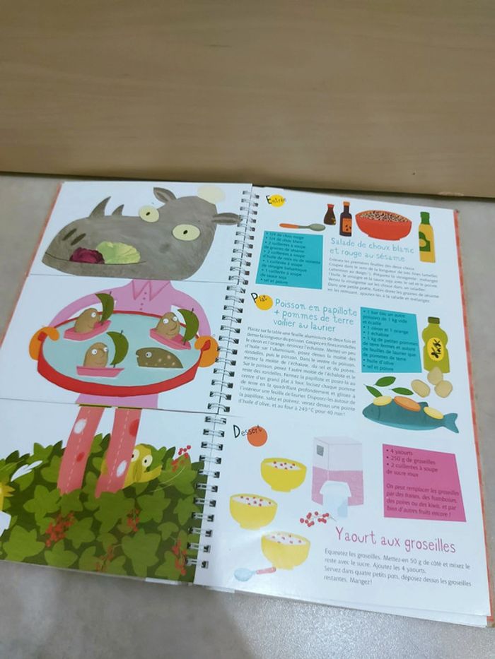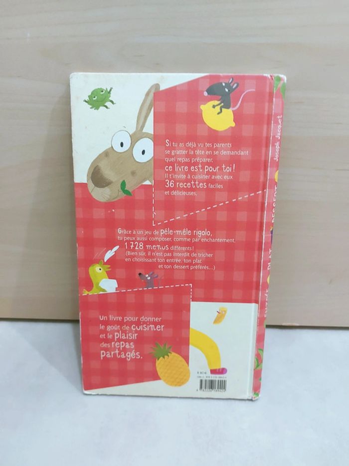 #mamansourire_livres #mamansourire_livres_pédagogiques Prix ferme mais livraison offerte pour les commandes de 65 euros ou plus Le concept est super ! L'enfant choisi l'entrée puis le plat puis le dessert et cela firme un personnage à gauche 36 recettes pour composer 1728 menus ! Attention je note satisfaisant car la couverture est bien usée et elle a de nombreuses taches [Je vends une centaine de livres (plusieurs école des max, mes premières découvertes, poussins, grund, émotions, livres en anglais), idéal pour crèche, assistante maternelle, bibliothèque d'école, professeur, institutrice, ief, etc., ainsi que des jeux d'apprentissage, de développement, montessori, tapis bébé et enfant, etc]