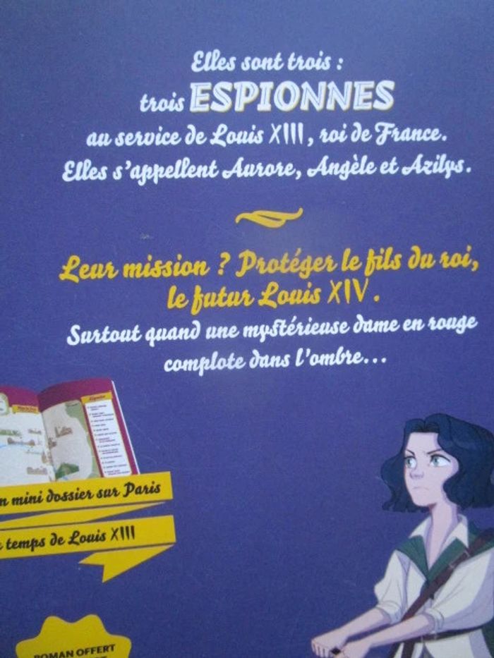 Le royaume de France est sous tension. Affaibli, Louis XIII ne fait plus confiance à personne. Pour protéger son héritier, le futur Louis XIV, qui n’a que deux ans, il décide de s’assurer l’assistance d’espionnes dont personne ne doit soupçonner le double jeu : Aurore de Saintonge, fille d’un de ses fidèles conseillers, et Angèle, fille d’un célèbre maître d’armes. Quand cette dernière découvre qu’une mystérieuse dame en rouge menace le dauphin, le roi leur ordonne de le transférer du château de Saint-Germain au Louvre dans le plus grand secret. Les routes ne sont pas sûres, mais en chemin Aurore et Angèle se découvrent une alliée: Azilys... Éditeur ‏ : ‎ Rageot Poche ‏ : ‎ 160 pages Âge de lecture ‏ : ‎ Dès 8 ans Dimensions ‏ : ‎ 14 x 1.3 x 19 cm Livre en très bon état #louvre #roi #espionne #louisXIV #louisXIII #dauphin #chateau
