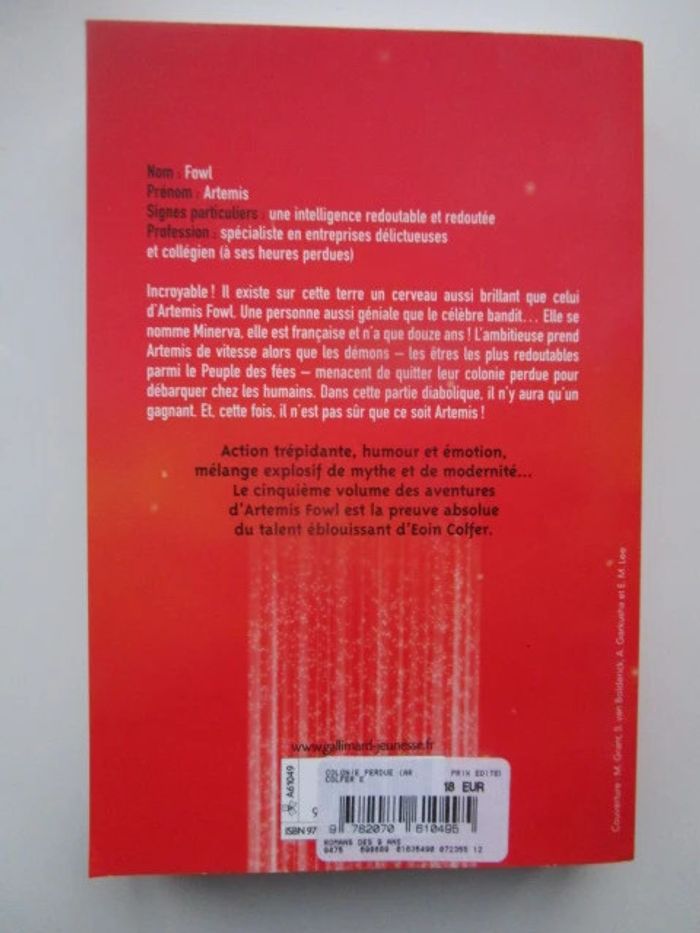 Incroyable ! Il existe sur cette terre un cerveau aussi brillant que celui d'Artemis Fowl. Une personne aussi géniale que le célèbre bandit... Elle se nomme Minerva, elle est française et n'a que douze ans ! L'ambitieuse prend Artemis de vitesse alors que les démons - les êtres les plus redoutables parmi le Peuple des fées - menacent de quitter leur colonie perdue pour débarquer chez les humains. Dans cette partie diabolique, il n'y aura qu'un gagnant. Et cette fois, il n'est pas sûr que ce soit Artemis ! Éditeur ‏ : ‎ Gallimard Jeunesse Broché ‏ : ‎ 432 pages Âge de lecture ‏ : ‎ 11 - 18 ans Dimensions ‏ : ‎ 14.2 x 2.5 x 21.5 cm Livre NEUF Je vends un autre livre de la même collection #phil_peg_artemisfowl #artemisfowl #eoincolfer