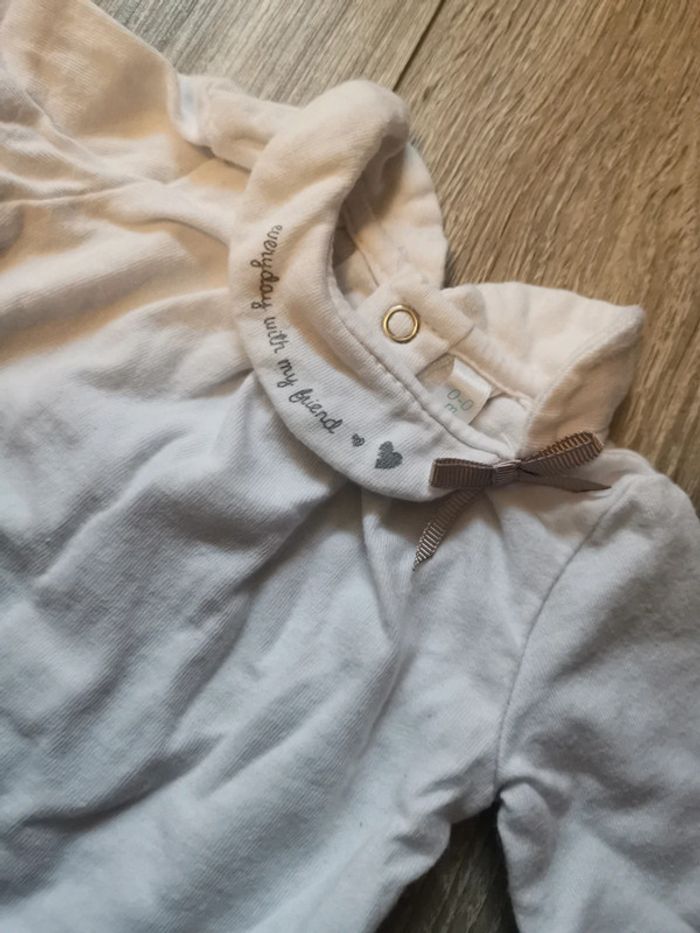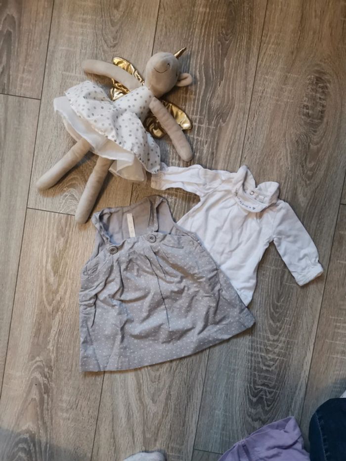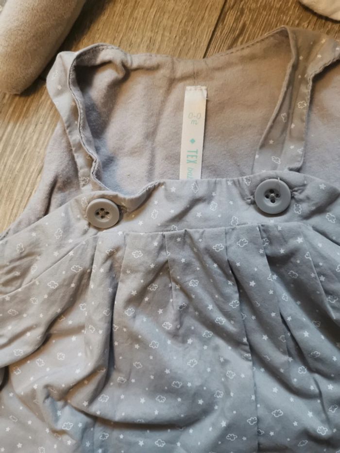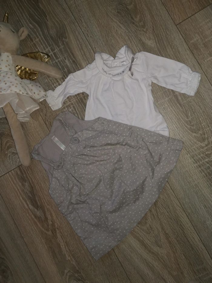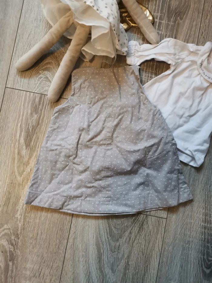 Très beau petit ensemble robe à bretelles + haut blanc manches longue, tex, naissance. Bon état général très peu porter. Désolé pas repassé.