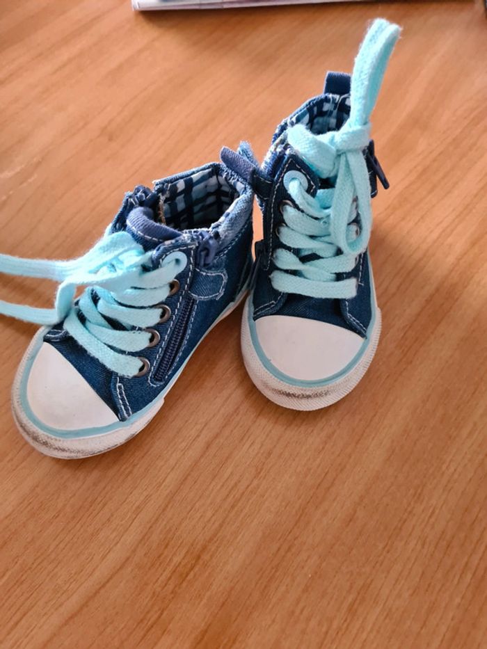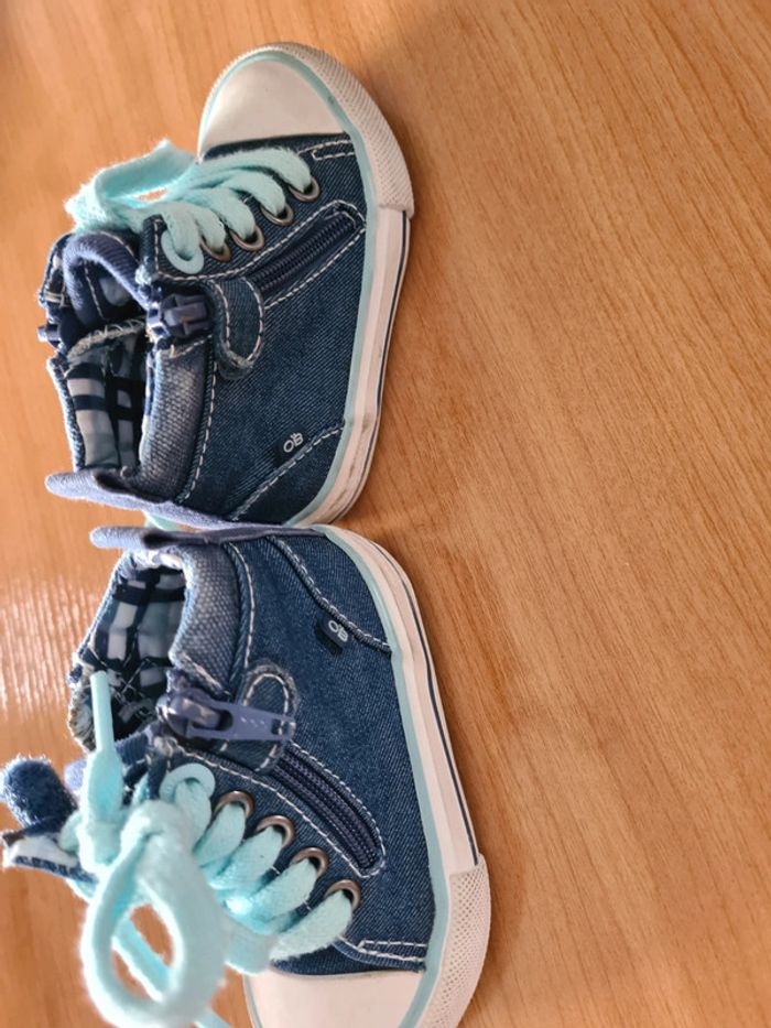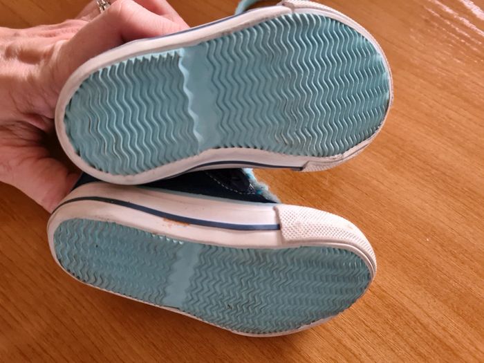 Hormis le contour un peu marqué cf photo 1, état proche du neuf. Chaussures très peu portées, mon fils ayant marché tard. Marque Obaibi. Pointure 19. Coloris bleu jean. Lacets turquoise