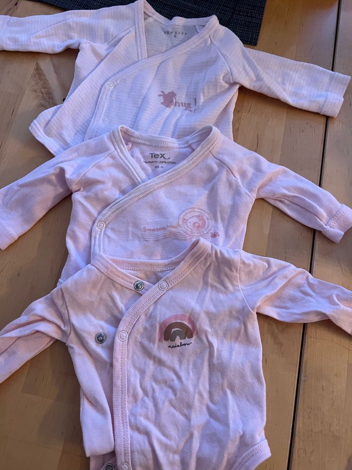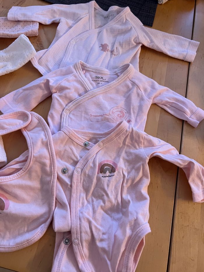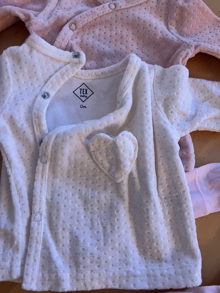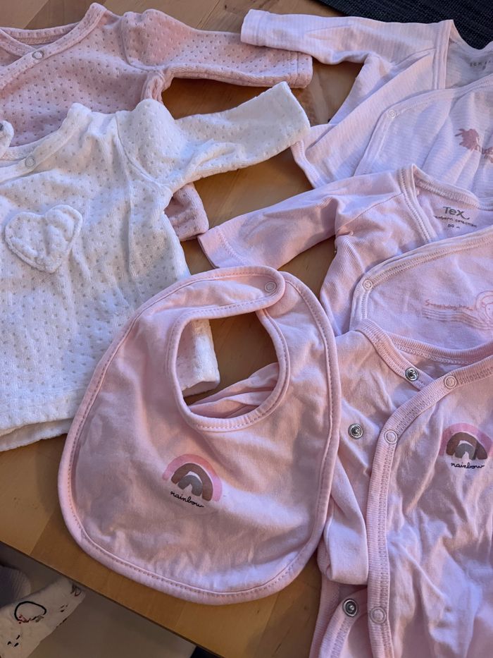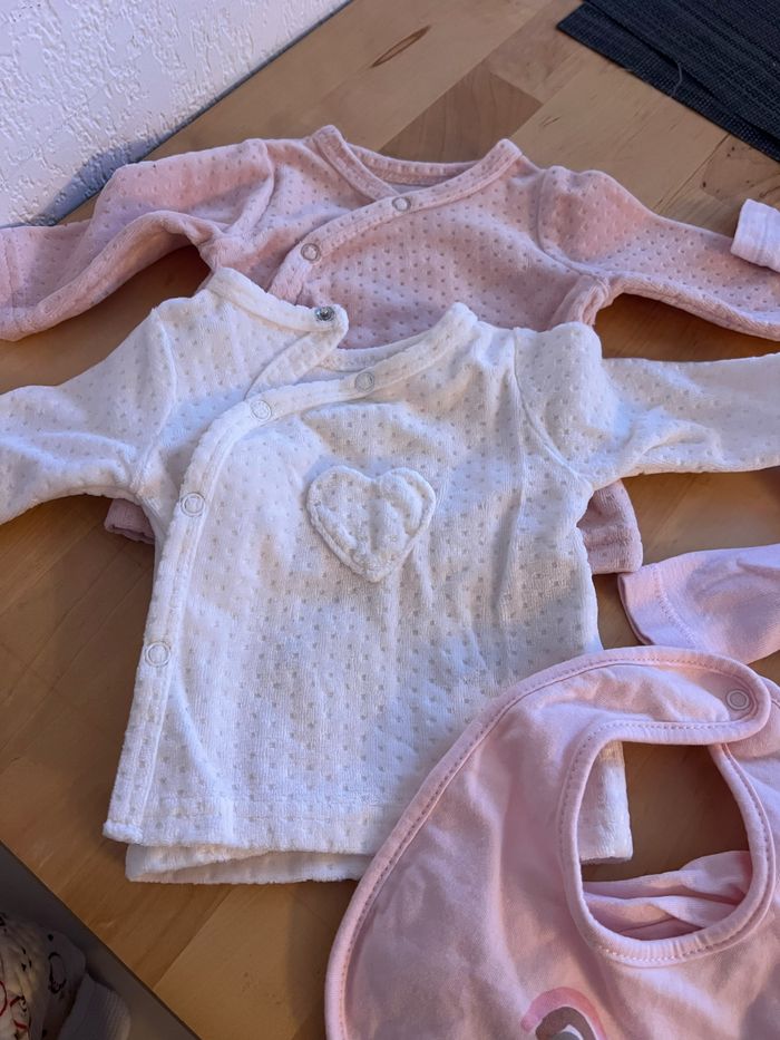 Je vends un lot naissance avec un petit bavoir, deux brassières rose et beige avec un cœur et pressions devant toutes douces ainsi que 3 bodies Les brassières sont neuves