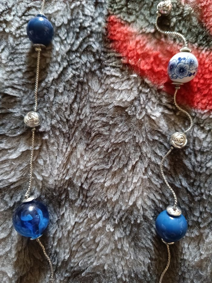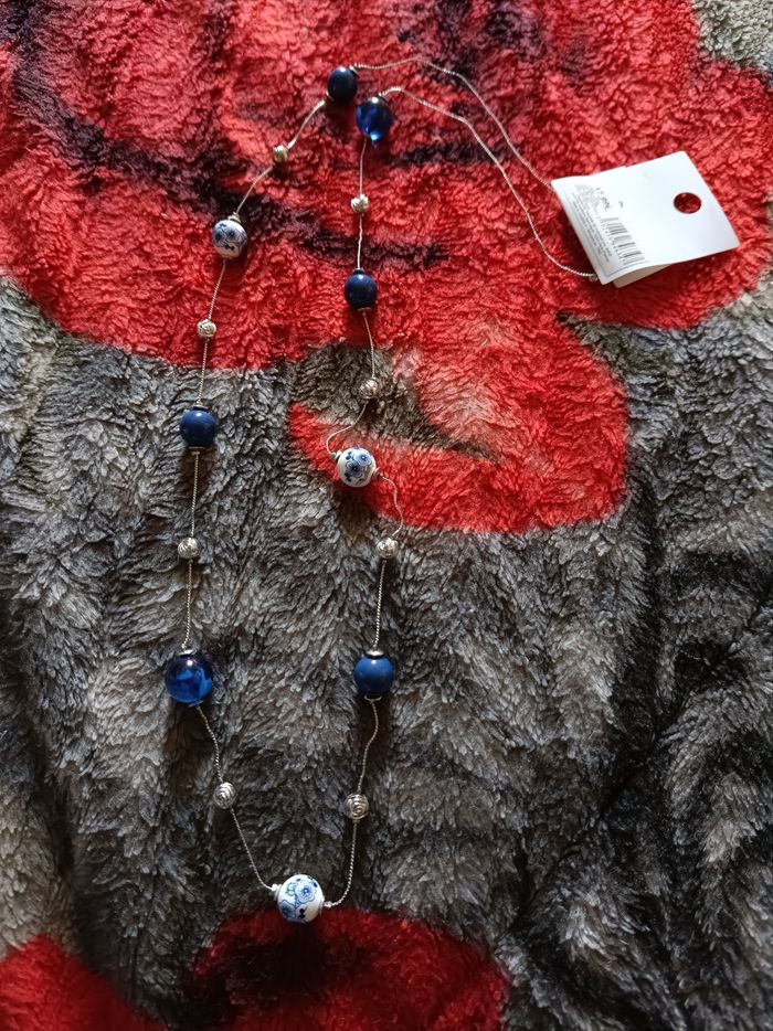 Sautoir argenté avec fleurs et des boules blanche bleu neuf