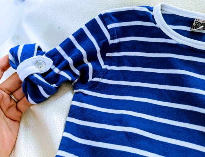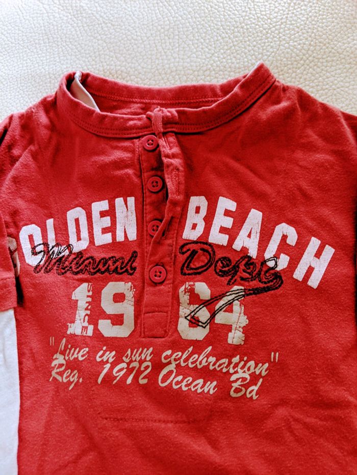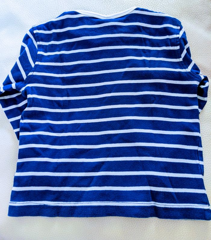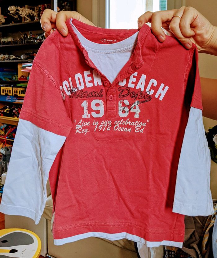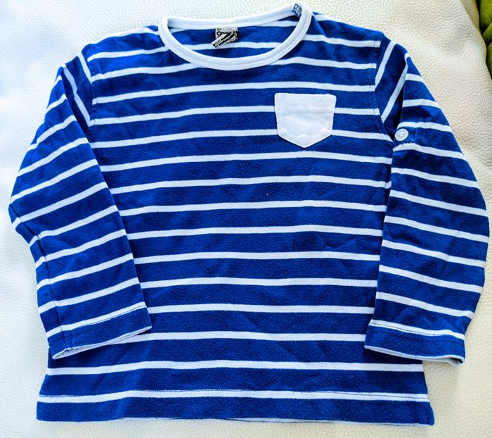 Marinière coton épais rayée petite poche blanche poitrine, portée 2-3 fois, très bon état Rayures bleu marine blanc Taille 4 ans marque Tape à l'oeil Tee-shirt effet superposition Couleurs blanc et rouge rosé qui tire un peu sur le corail Ouverture boutonnée sur le col Couleurs un peu passées Fines bouloches, bien porté mais en bon état Taille 4 ans - 102 cm marque Vertbaudet