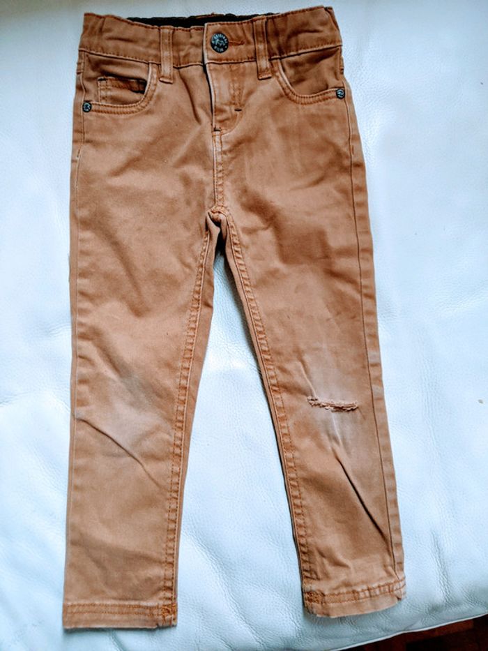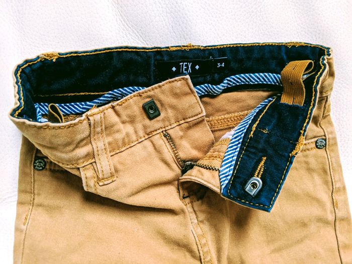 Couleur Camel ou caramel Taille réglable avec élastique boutonné Marque tex Pantalon un peu déchiré au niveau genou gauche
