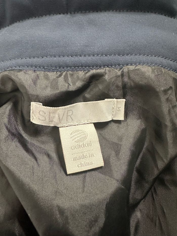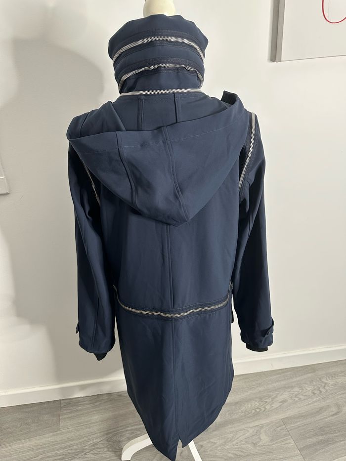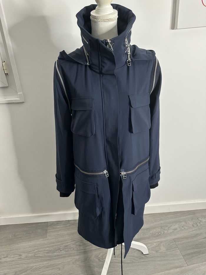Trench Parka - Excellent état - Taille 38 équivalent M - Bleu marine et argenté - Adidas SLVR - Zips argentés - 3 capuches, une extérieur et 2 zippées dans la nuque - Possibilité de retirer les manches, la capuche et la partie inférieure avec des zip - 100% Polyester - Doublure intérieure noire Dimensions: - 43cm niveau épaules - 50cm niveau aisselles - 91cm de long