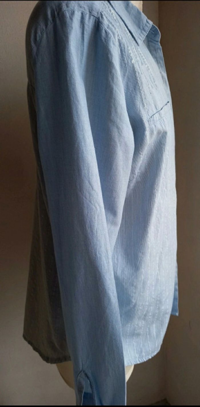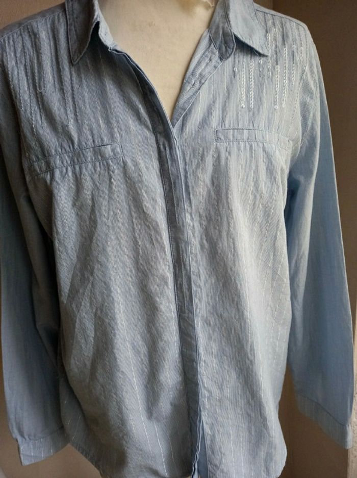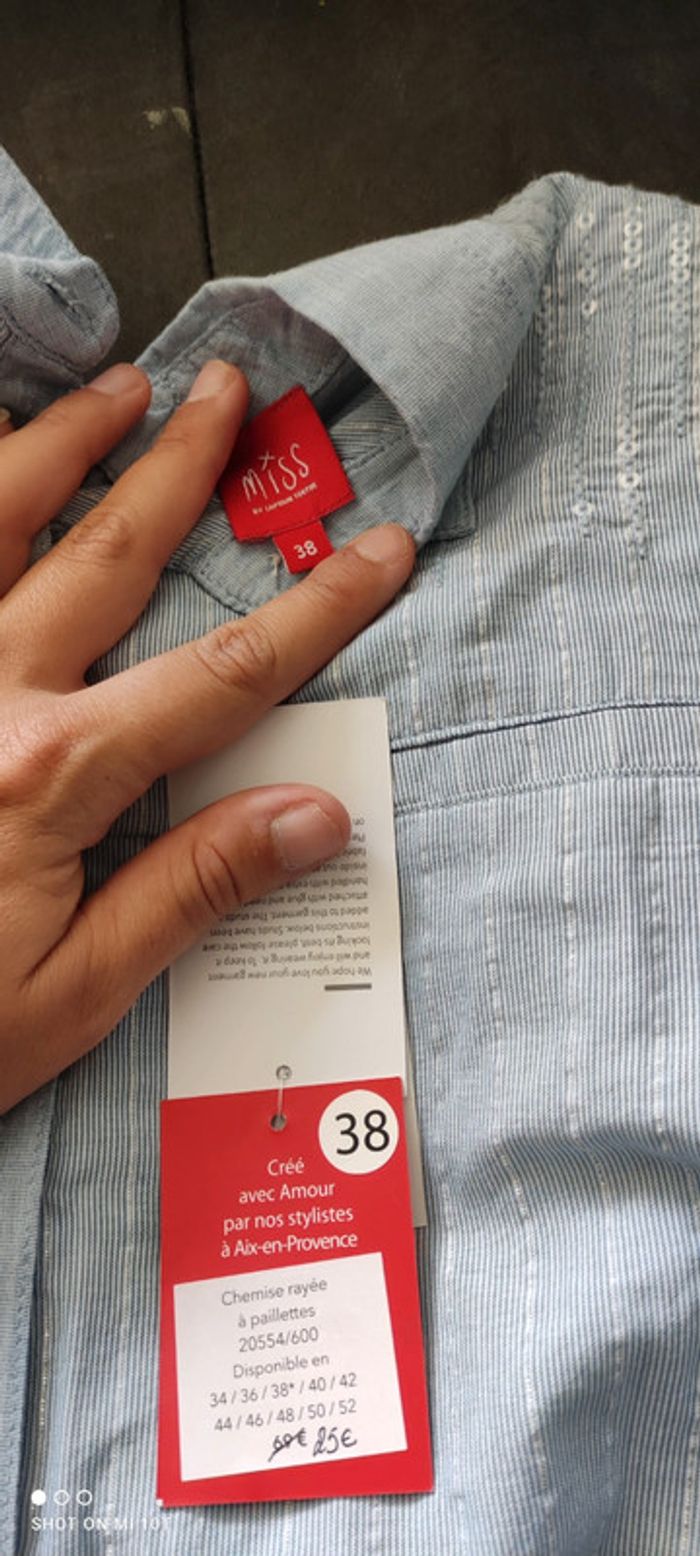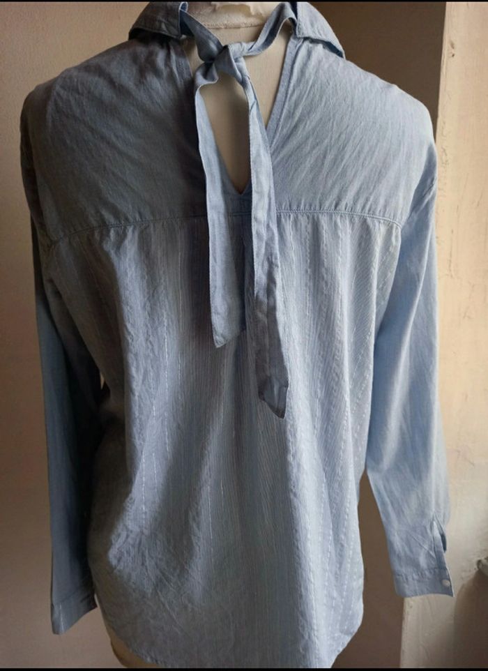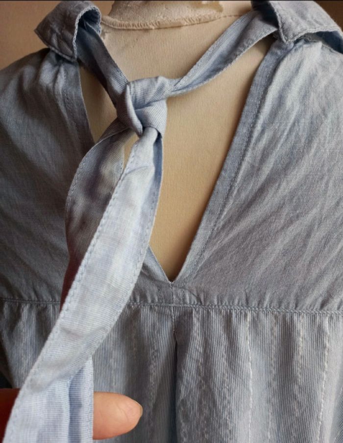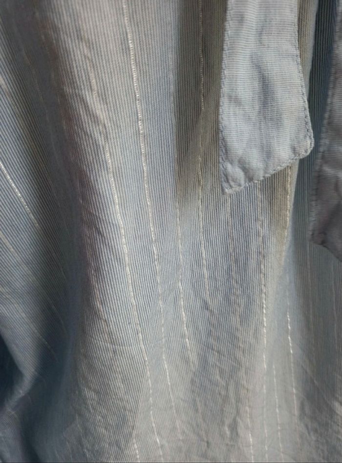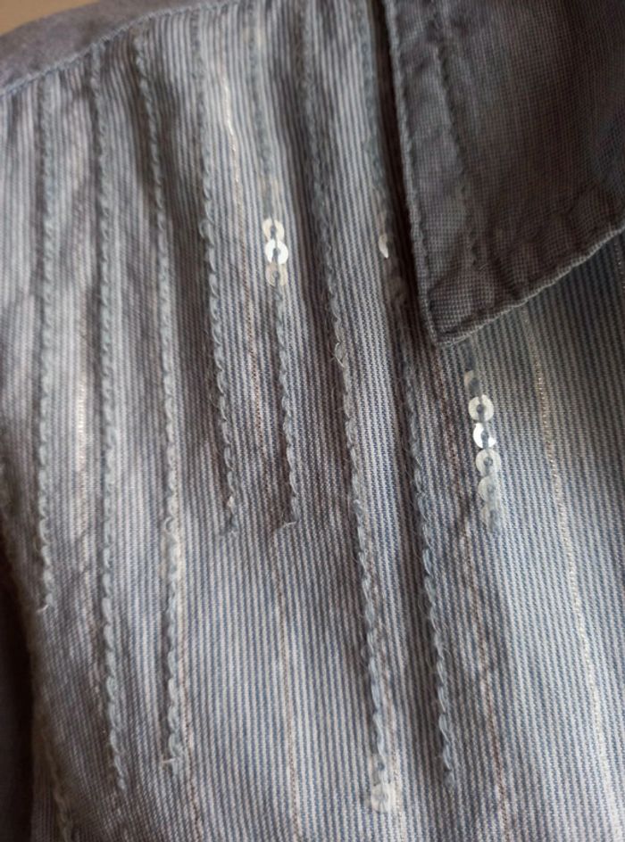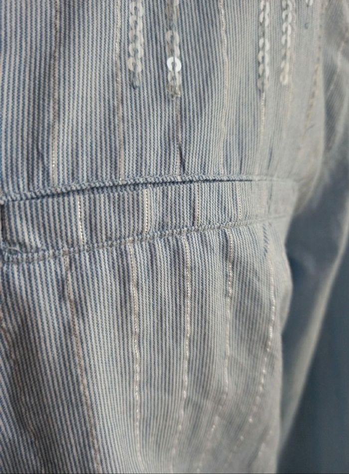 Fin d'activité chez Captain Tortue. Je vends mon stock des anciennes collections. Articles neuf, avec étiquette. Très belle chemise avec strass sur les épaules devant. De fines rayures argenté sur le devant et au dos. 2 fausses poches sur l avant. Lien à nouer en haut du dos. Esprit garçonne,chic et féminine. Valeur initiale 69€, vendu 25€