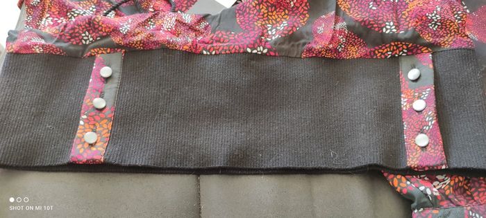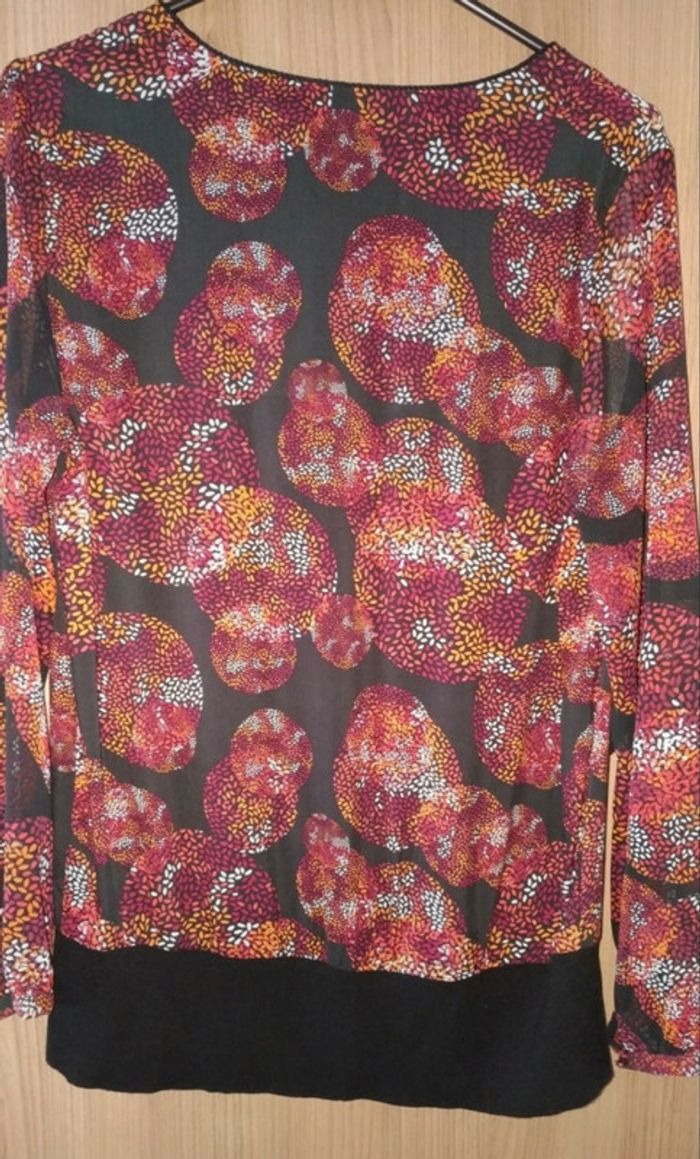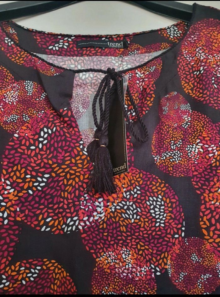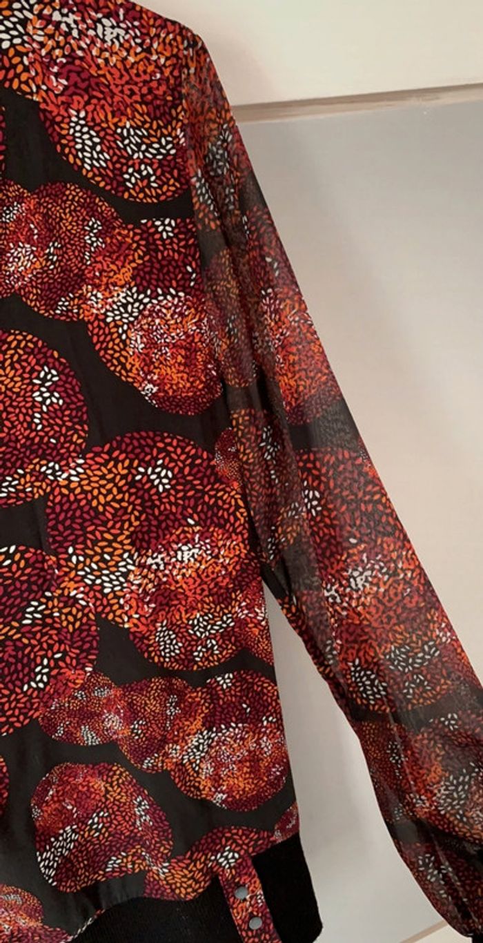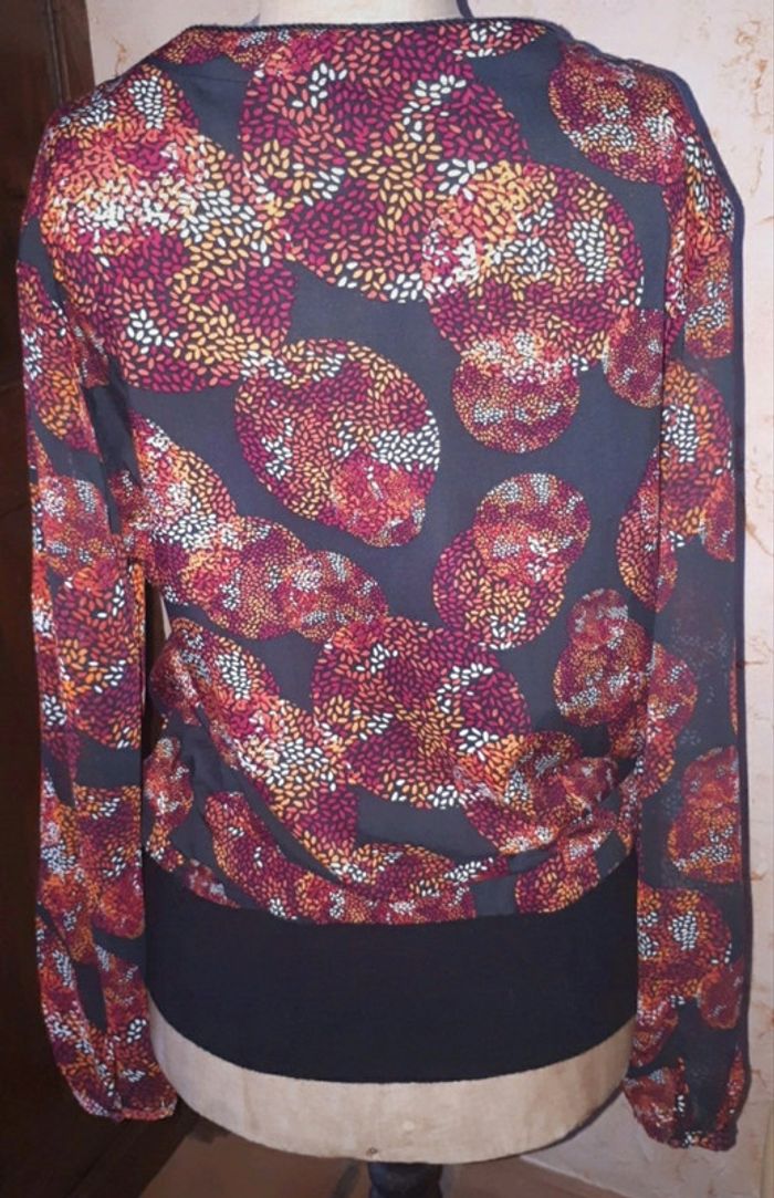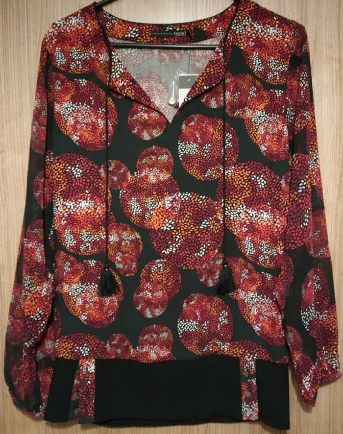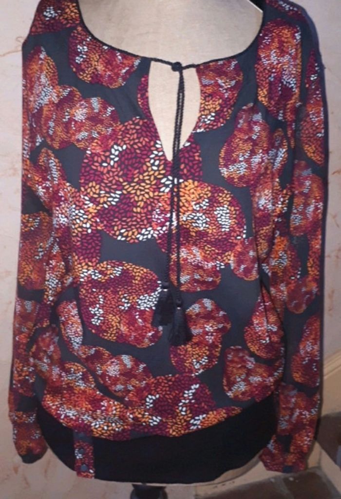 Fin d'activité chez Captain Tortue. Je vends mon stock des anciennes collections. Articles neuf, avec étiquette. Chemisier motif cercle bordeaux sur fond noir. Légère transparence sur les manches. Fausse ceinture en bas pour un effet blouser. Lien sur décolte avec pompon. Valeur initiale 85€, vendu 30€