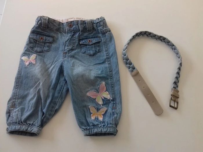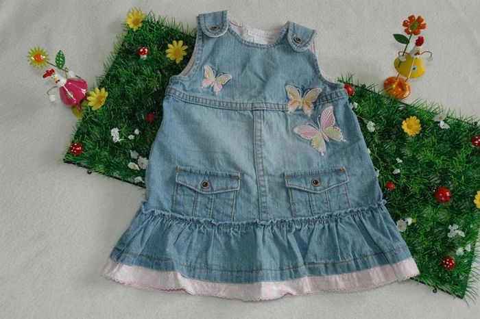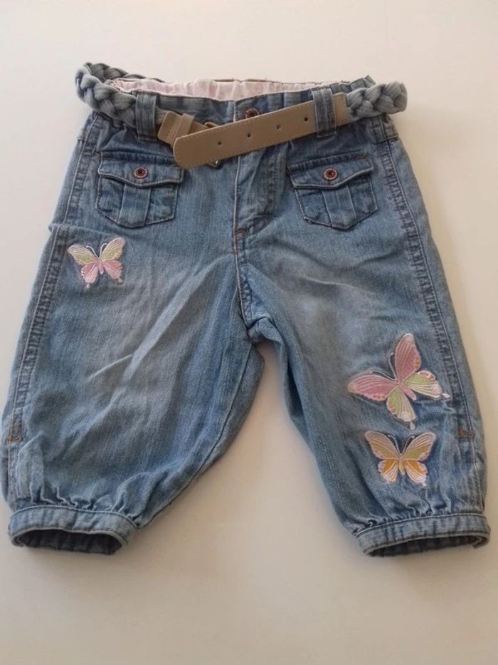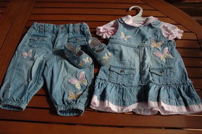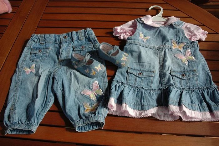 Bel ensemble avec chaussures assorti 6-9 mois Robe + haut rose + ceinture + pantalon + chaussures en jean's brodé