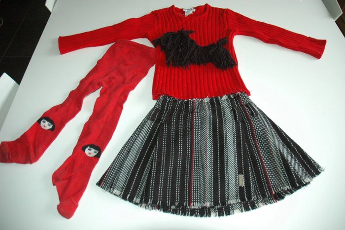 Splendide ensemble Sonia RYKIEL 4 ans Bel ensemble pull et jupe en très bon état. J'offre le collant assorti qui est usagé.