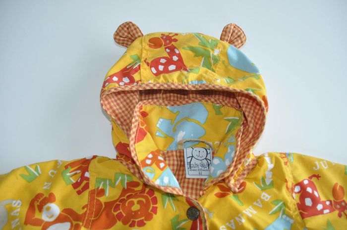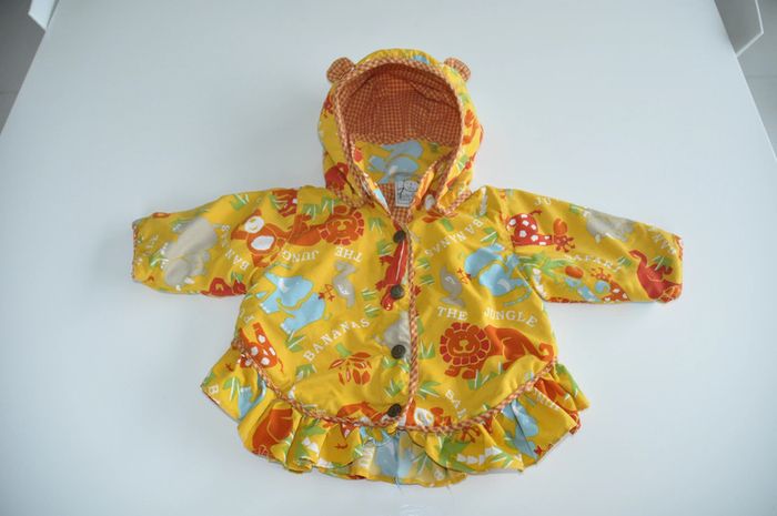 Motif Jungle. Capuche avec petites oreilles. Volants sur la bas de la veste. Capuche amovible (fixée par des boutons)