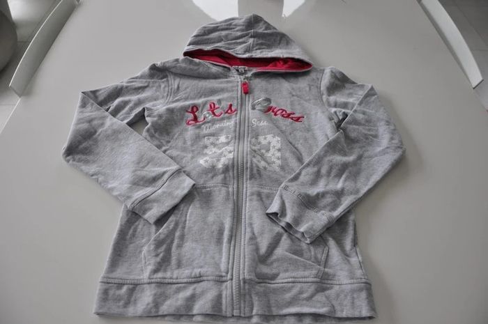 Sweat à capuche 12 ans Très bon état. Avec motif blanc rose et fils argenté. Regardez mes autres articles. Possibilité de mettre plusieurs articles dans le même colis.