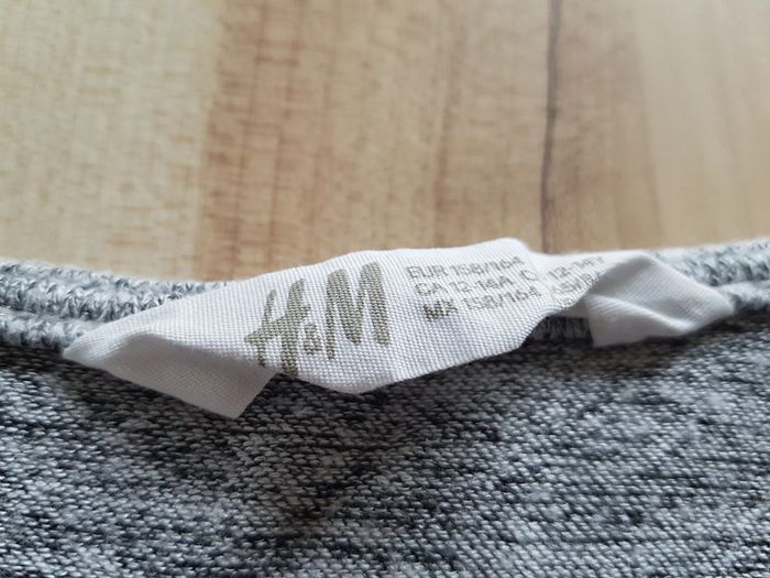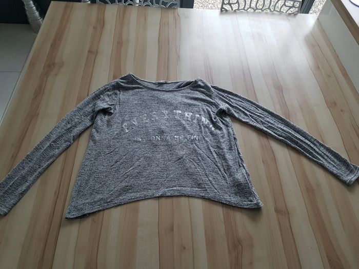 Top avec découpe dos taille 12-14 Très bon état avec écriture argent fond gris chiné