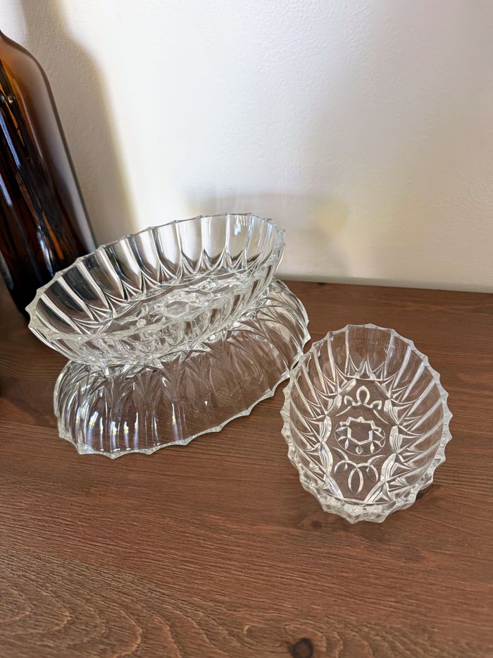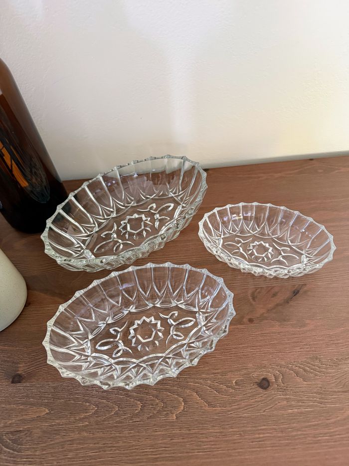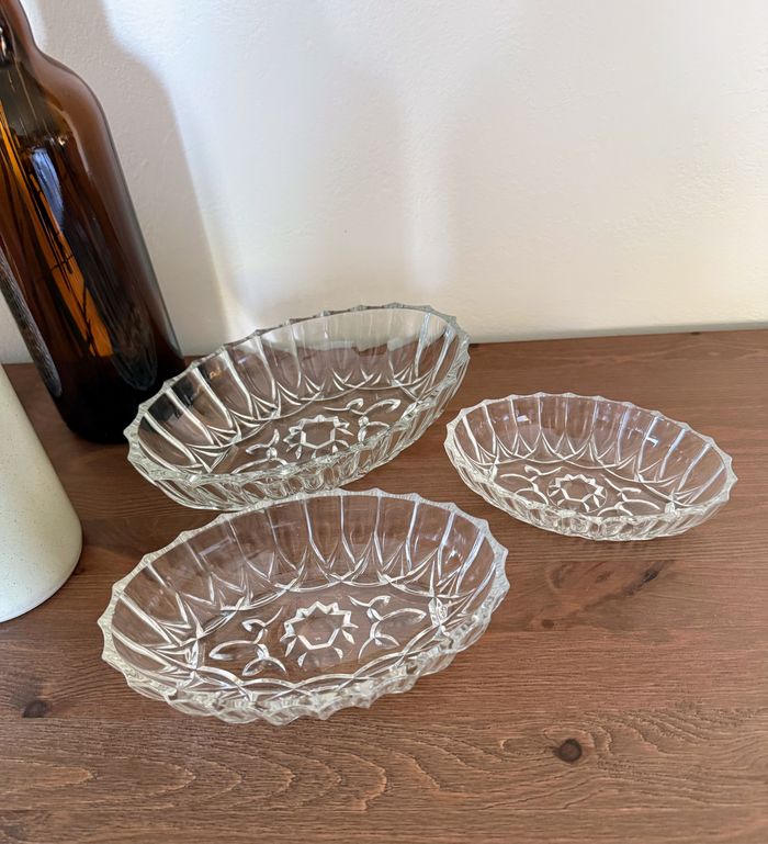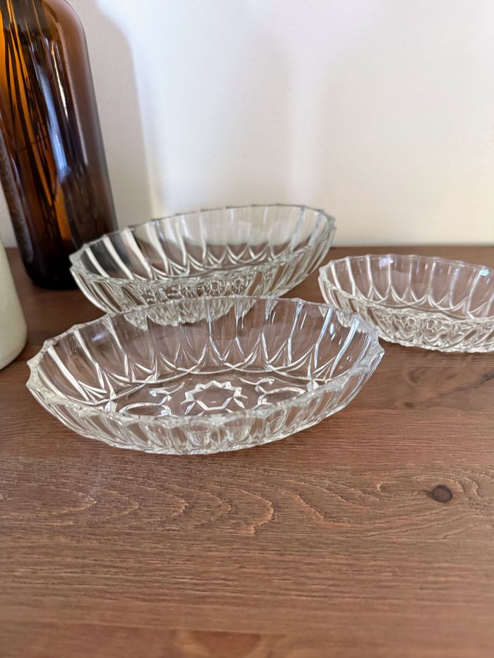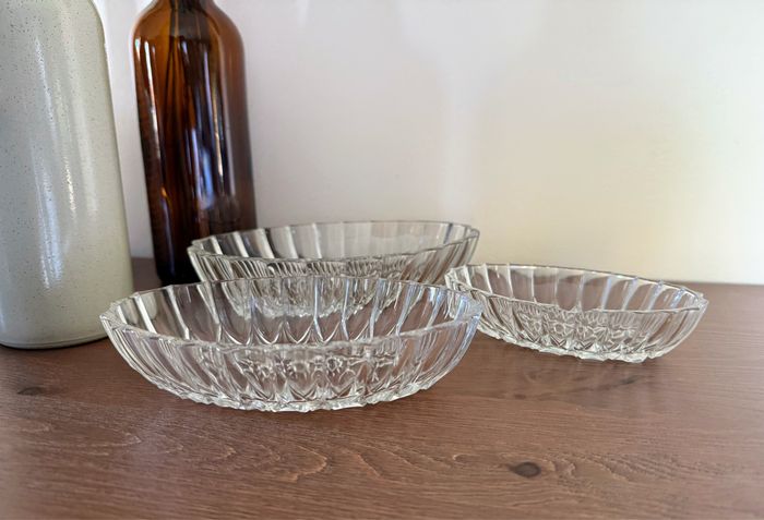 3 Raviers ou ramequins Des années 60/70 En verre moulé - Objet publicitaire HUILOR DULCINE Dimensions : Grand 19,5 x 13 x 5 cm Moyen 17 x 11 x 5 cm Petit 14 x 9,5 x 4 cm