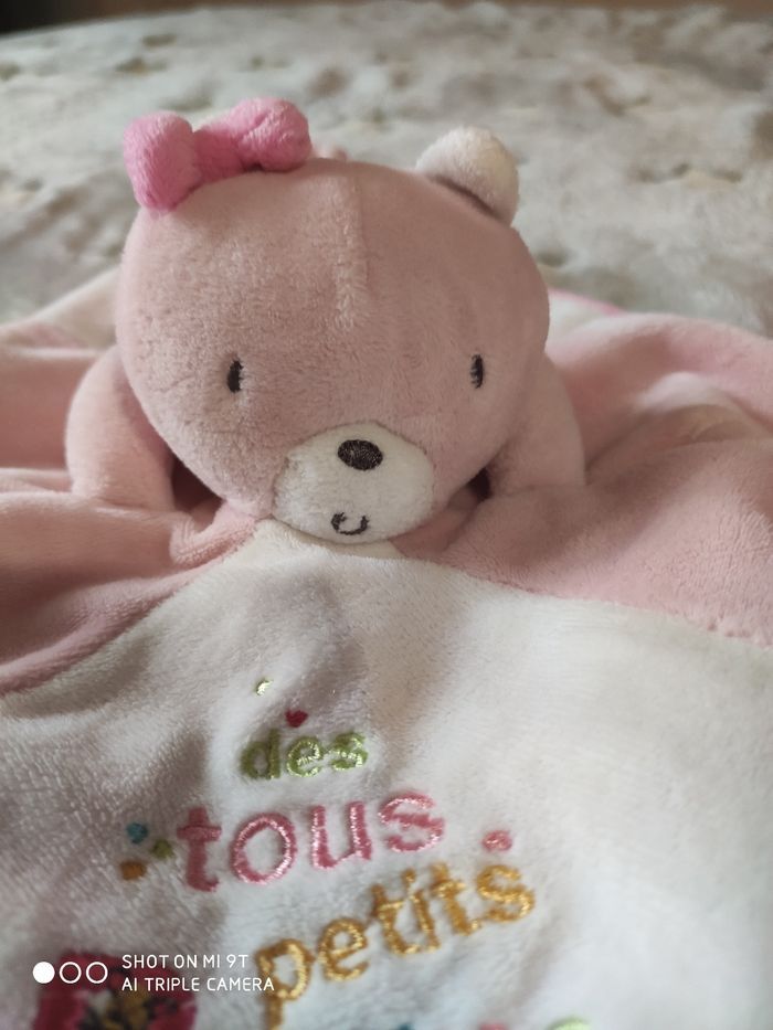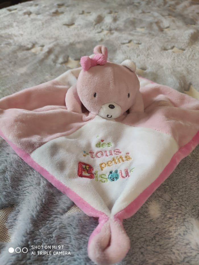 Doudou plat fille en très bon état pas de tâches ni trous vient de passer à la machine à laver. Couleur rose et blanc avec ses mots tout doux.