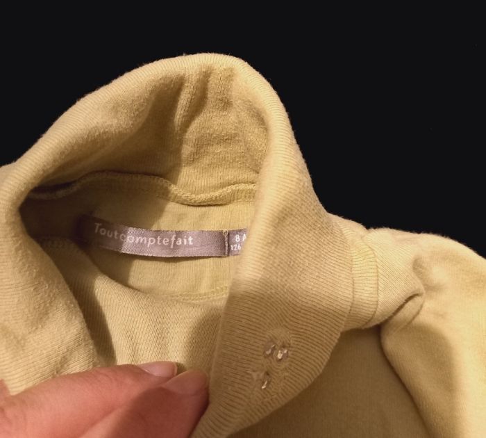 T-shirt enfant 8 ans en très bon état couleur vert, manches longues, col roller, 100% coton, marque : tout compte fait.
