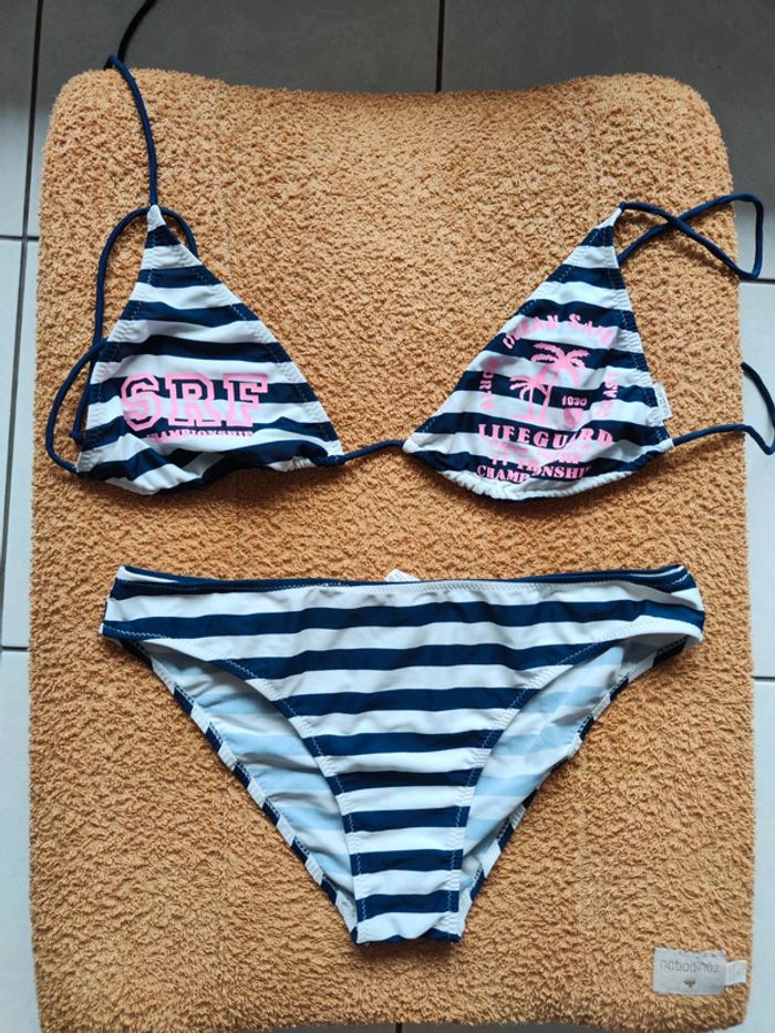 Maillot de bain 2 pièces Taille 44 Rayé bleu blanc à motifs Haut réglable Culotte non réglable Très bon état #ceciliabasset0689_maillotdebainfemme