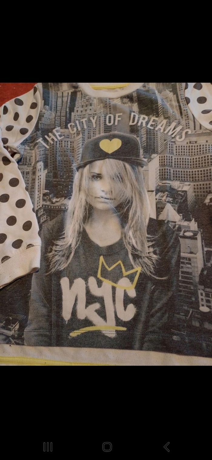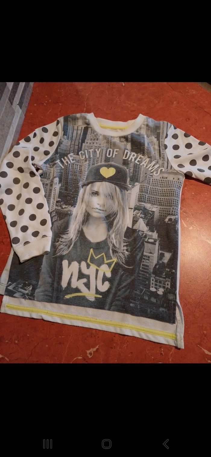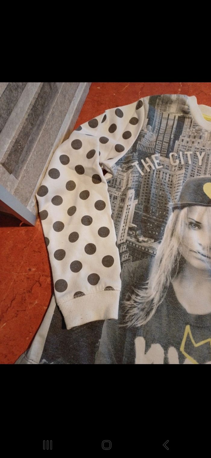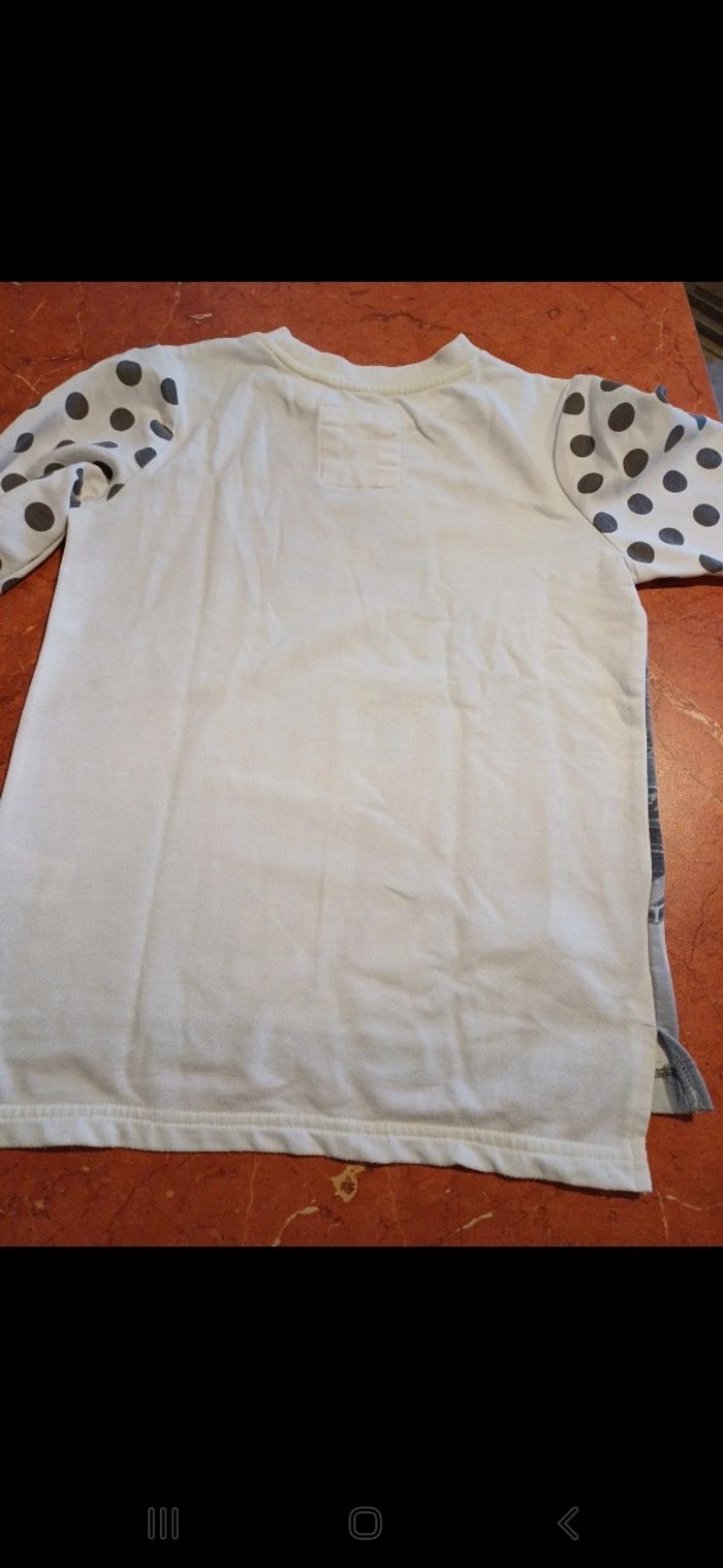 Joli sweat léger, col rond avec motifs à l avant et pois sur les manches. Légèrement bouloché sur le bas