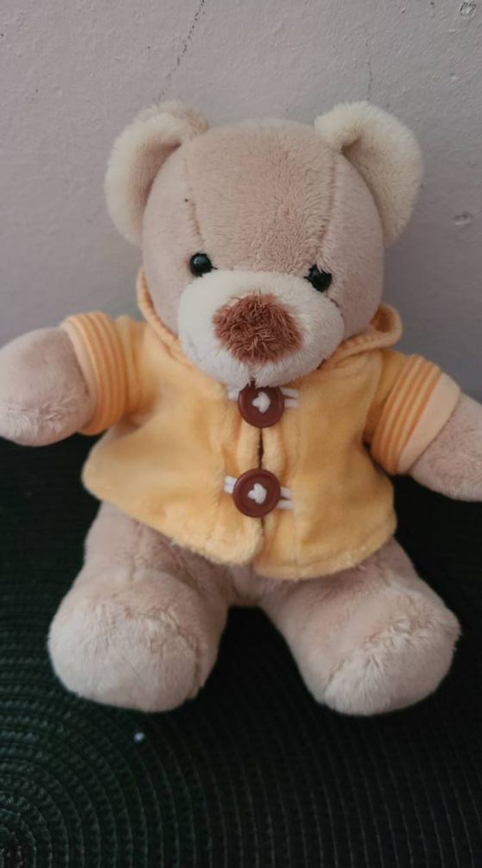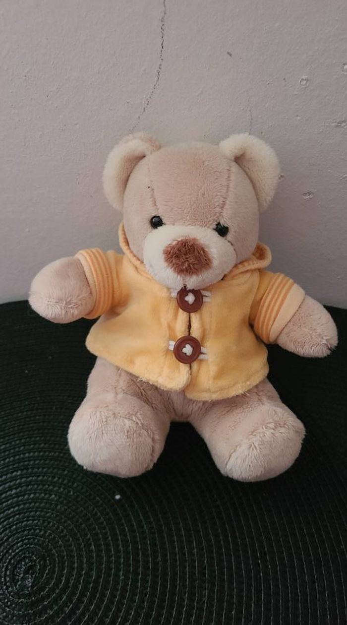 Doudou peluche ours beige pull capuche jaune Kiabi Nicotoy 48