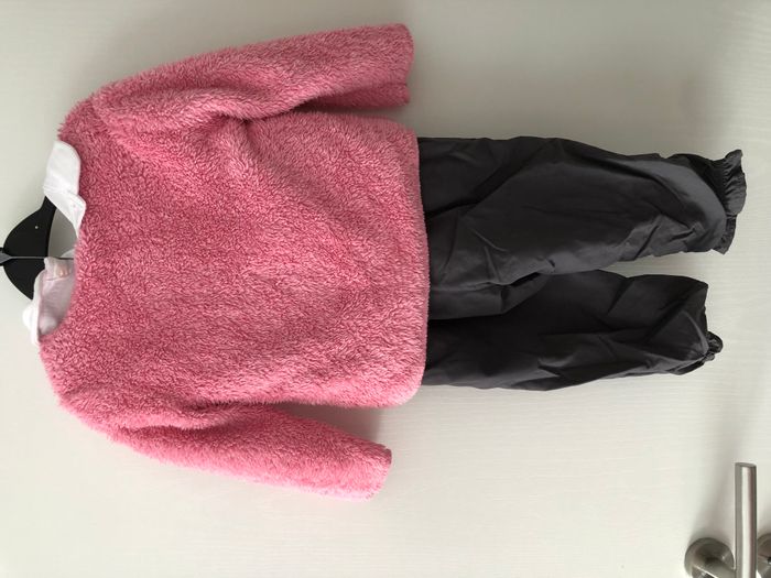 Joli ensemble fille composé de 3 pièces: un haut manches longues, un pantalon élastiqué à la taille et un gilet. Motif lapins Taille 18 mois