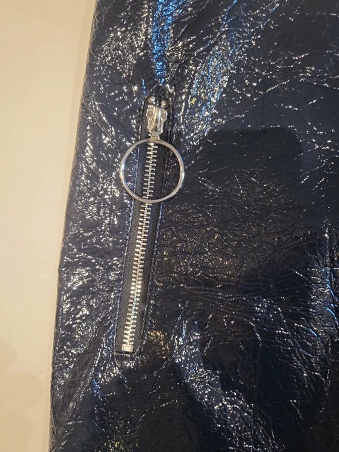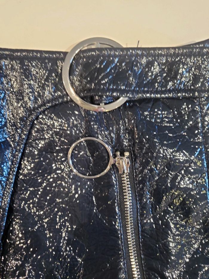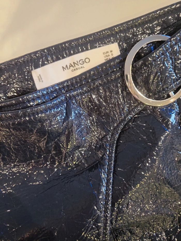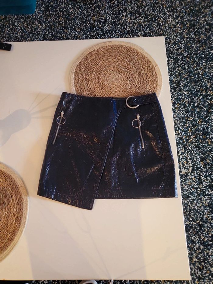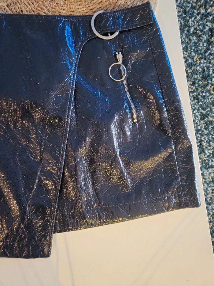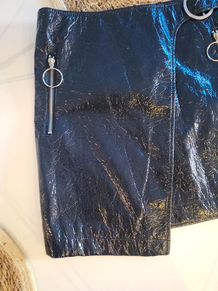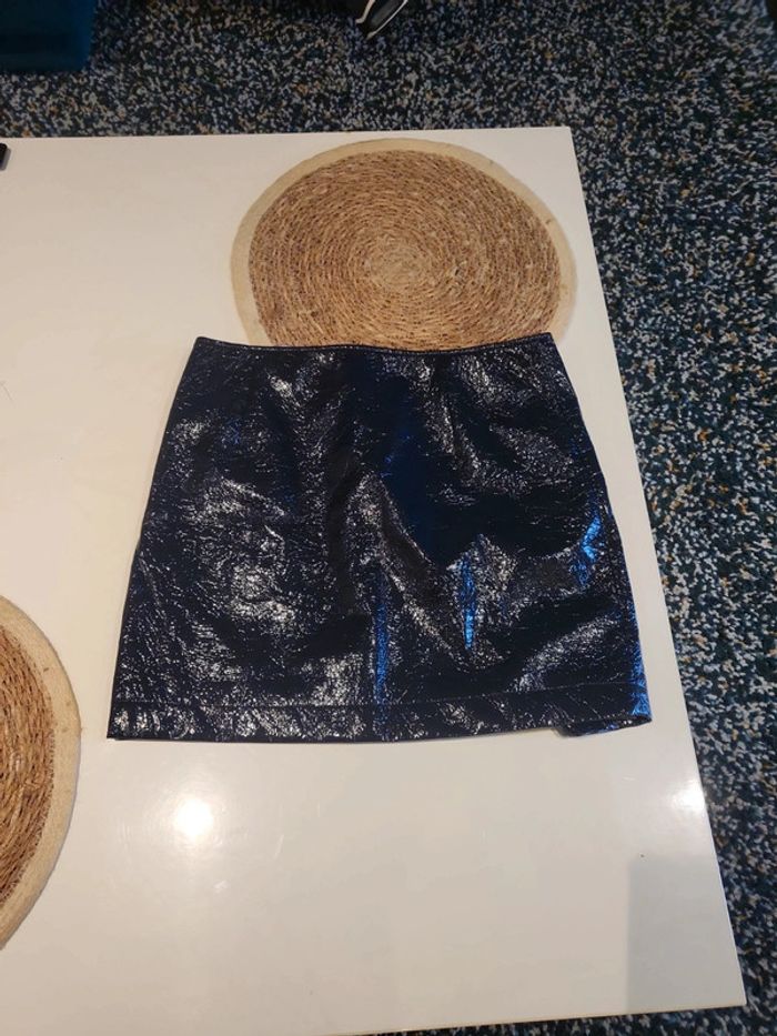 Jupe courte, effet brillant, couleur bleu marine foncé, taille M, poches latérales, en parfait état. Mesure taille 40cm, longueur 40cm. #jupecourte #mango #brillante #taillem #reductionsurleslotsactivees