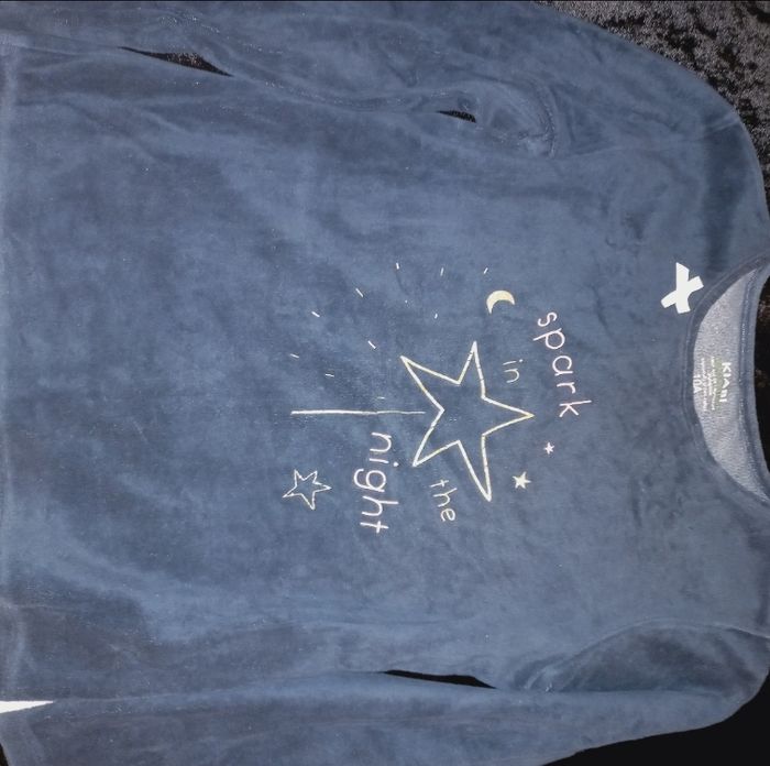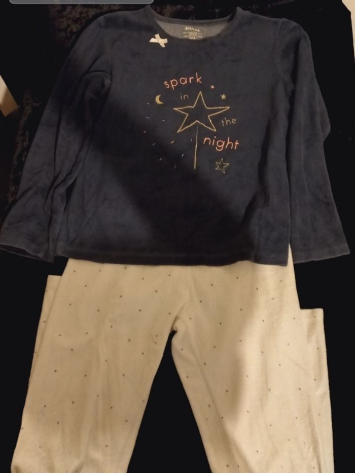 Pyjama pour enfant 10 ans, en très bon état couleur bleu et blanc, marque : kiabi, 76% coton et 24 % polyester.