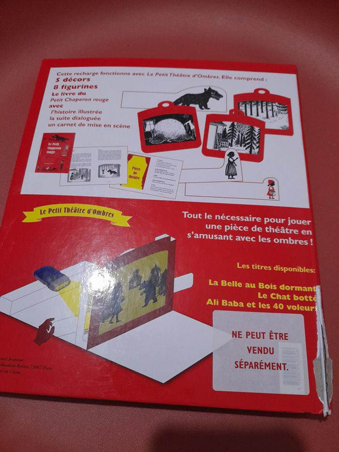 le petit chaperon rouge - théâtre d’ombres 1 livre explicatif, format théatre Les personnages plastifiés, Les décors l'intérieur de la pochette est un peu abimée; la tranche est également abimée en bas le livre est en bon état voir photos autres objets dans le dressing, par exemple sous: #scolairescoubi62