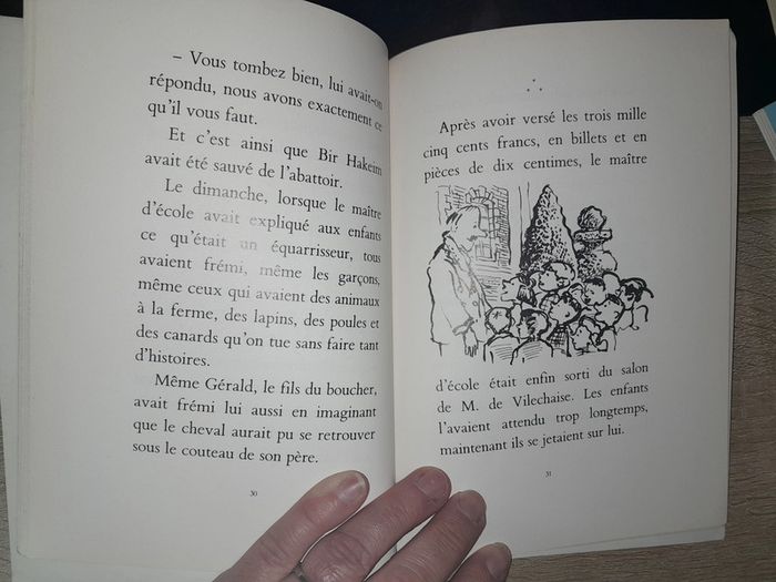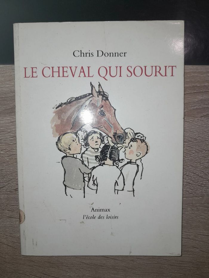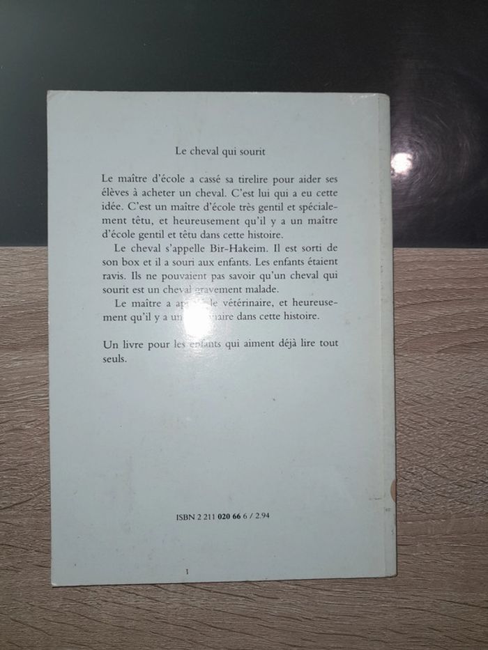 roman école des loisirs - Le cheval qui sourit 6-8 ans couverture tachée #livreenfantscoubi62 Le maître d'école a cassé sa tirelire pour aider ses élèves à acheter un cheval. C'est lui qui a eu cette idée. C'est un maître d'école très gentil et spécialement têtu, et heureusement qu'il y a un maître d'école gentil et têtu dans cette histoire. Le cheval s'appelle Bir-Hakeim. Il est sorti de son box et il a souri aux enfants. Les enfants étaient ravis. Ils ne pouvaient pas savoir qu'un cheval qui sourit est un cheval gravement malade. Le maître a appelé le vétérinaire, et heureusement qu'il y a un vétérinaire dans cette histoire.