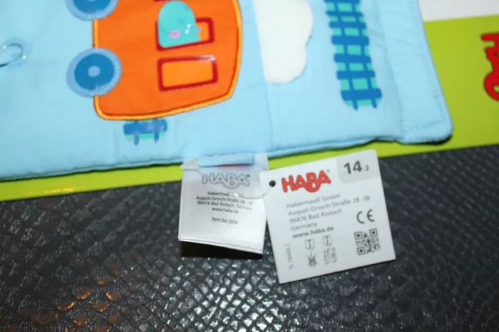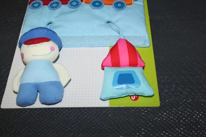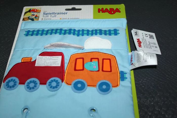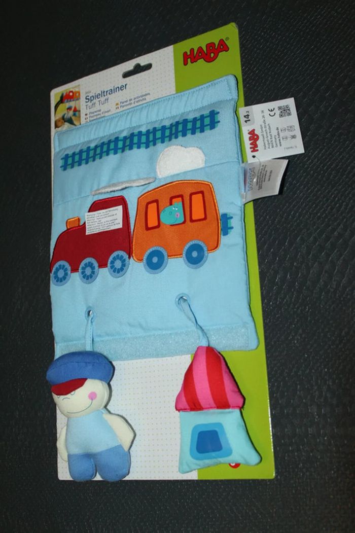 panneau d'éveil Haba, neuf, à installer sur la poussette, le cosy, le parc...., à partir de la naissance, la fenêtre du petit train sous l'autocollant est un miroir, le marin a un bouton couineur, la maison émet un bruit de papier froissé, lorsque le bébé tire sur l'un l'autre monte... #éveilscoubi62