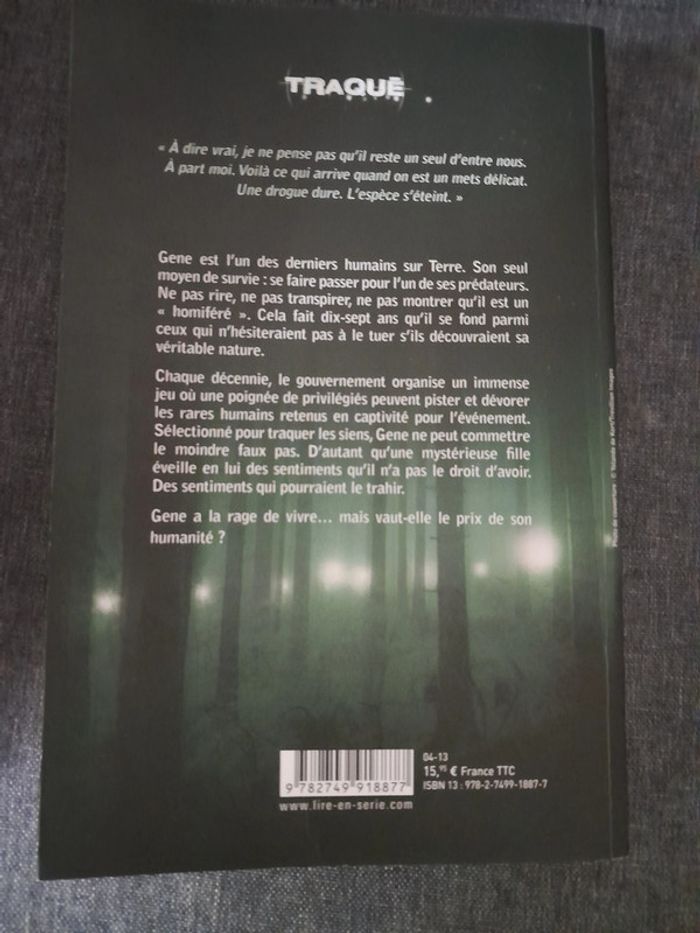 livre grand format - Traqué Gene est l’un des derniers humains sur Terre. Le seul moyen de survie pour cet adolescent : se faire passer pour l’un de ses prédateurs. Ne pas rire, ne pas transpirer, ne pas montrer qu’il est un humain, un « homiféré ». Cela fait dix-sept ans qu’il vit secrètement parmi ceux qui n’hésiteraient pas à le tuer s’ils découvraient sa véritable identité. Malgré tout, Gene est parvenu à se fondre parmi ces « autres » et à créer un semblant de vie normale. Mais sa routine est bouleversée, et sa sécurité, menacée, le jour où il est sélectionné pour participer au grand jeu : la Traque. Toutes les décennies, le gouvernement organise une immense chasse où seule une poignée de privilégiés peuvent pister, abattre et dévorer les rares humains survivants gardés en captivité pour l’événement. Formé à l’Institut pour traquer ses semblables, Gene est sur le qui-vive. Car désormais, sa vie s’organise en meute avec les chasseurs, et le moindre faux pas pourrait trahir sa condition et lui être fatal. Parviendra-t-il à maintenir l’illusion, alors que les soupçons sur sa vraie nature s’alourdissent ? Gene a la rage de vivre… mais vaut-elle le prix de son humanité ? #livrescoubi62