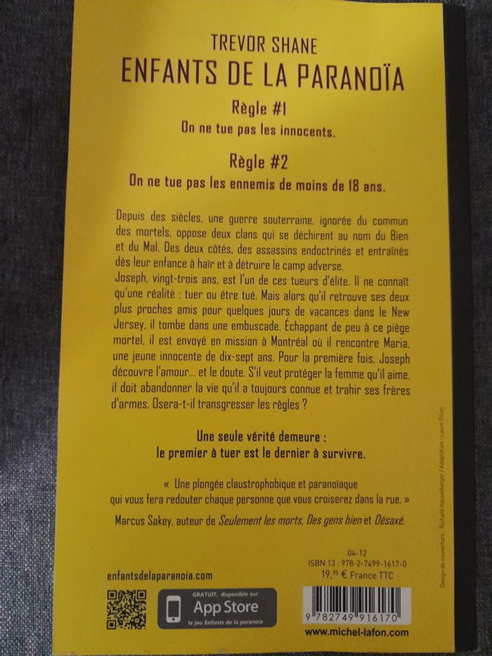 livre grand format - Enfants de la paranoïa Règle un : on ne tue pas les innocents. Règle deux : on ne tue pas les ennemis de moins de 18 ans. Depuis des siècles une guerre souterraine, ignorée du commun des mortels, oppose deux anciens clans qui se déchirent au nom du Bien et du Mal. Des deux côtés : des assassins endoctrinés et entraînés dès leur plus tendre enfance à haïr et détruire le camp adverse. Joseph, vingt-trois ans, est l’un de ces tueurs d’élite. Il ne connaît qu’une réalité : tuer ou être tué. Mais lors d’une réunion dans le New Jersey, il tombe dans une embuscade. Échappant de peu à ce piège mortel, Joseph se réfugie à Montréal où il rencontre Maria, une jeune innocente de seize ans. Pour la première fois, il découvre le doute. S’il veut protéger la femme qu’il aime, il doit abandonner la vie qu’il a toujours connue et trahir ses frères d’armes. Osera-t-il transgresser les règles ? Une seule vérité demeure : le premier à tuer est le dernier à survivre. #livrescoubi62