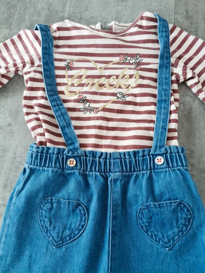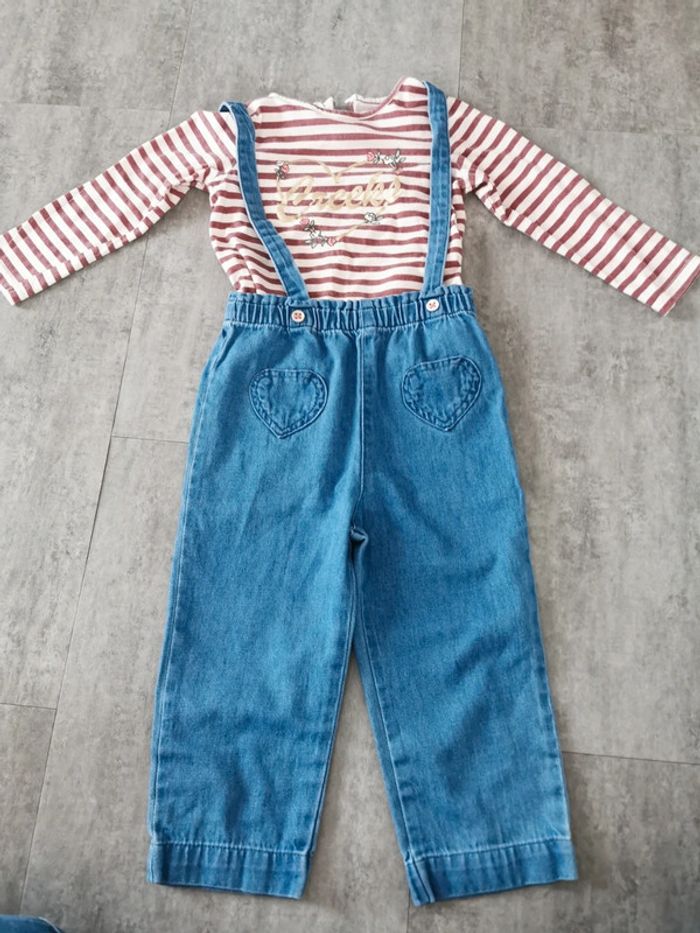 Ensemble pantalon jean à bretelles et t-shirt à manches longues Jamais porté juste lavé 36 mois #tiffanyostertag_fille3ans