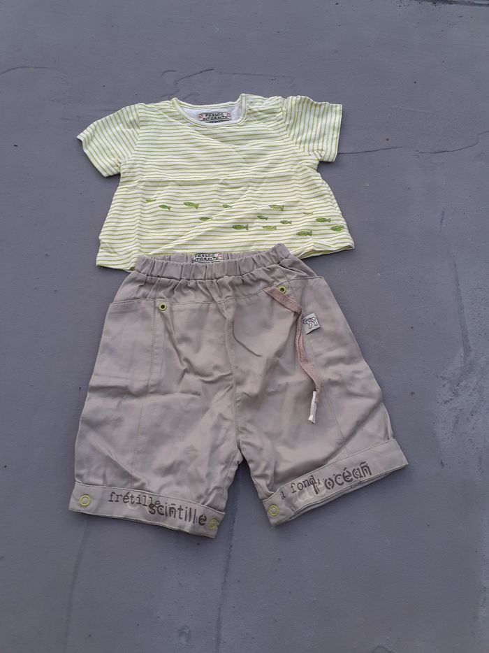 Vends short et tee-shirt beige et vert - taille 3 mois- Marque FESSÉE INTERDITE - en très bon état non tachés Possibilité vente en lot