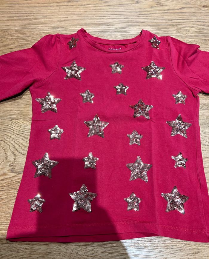 T-shirt rouge à étoiles dorées, manches longues. Excellent état. Taille : 6 ans
