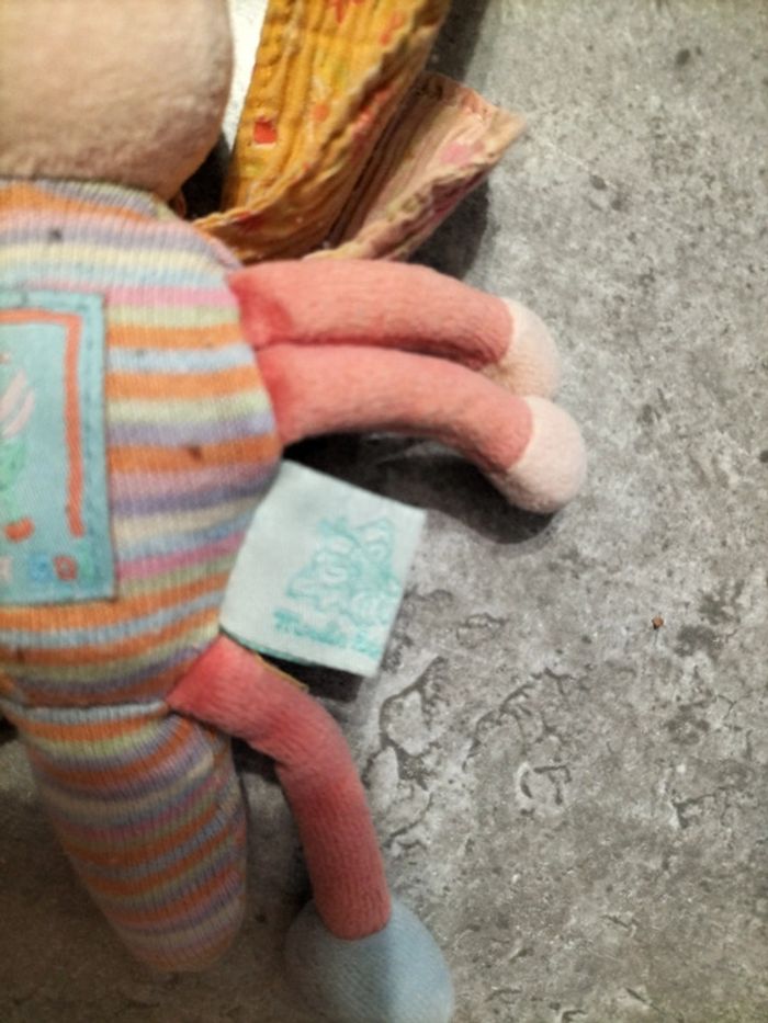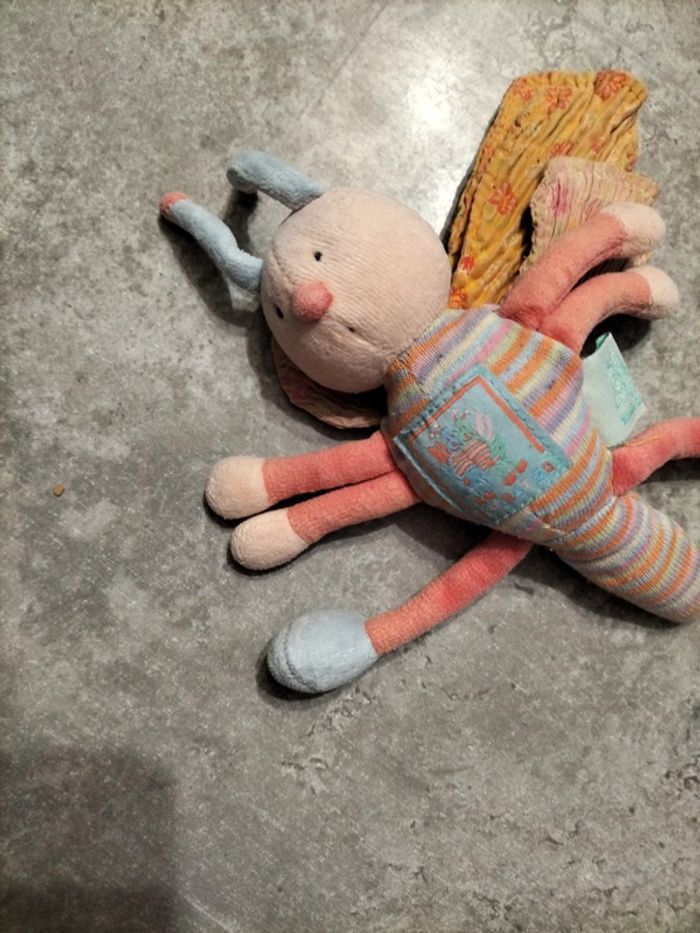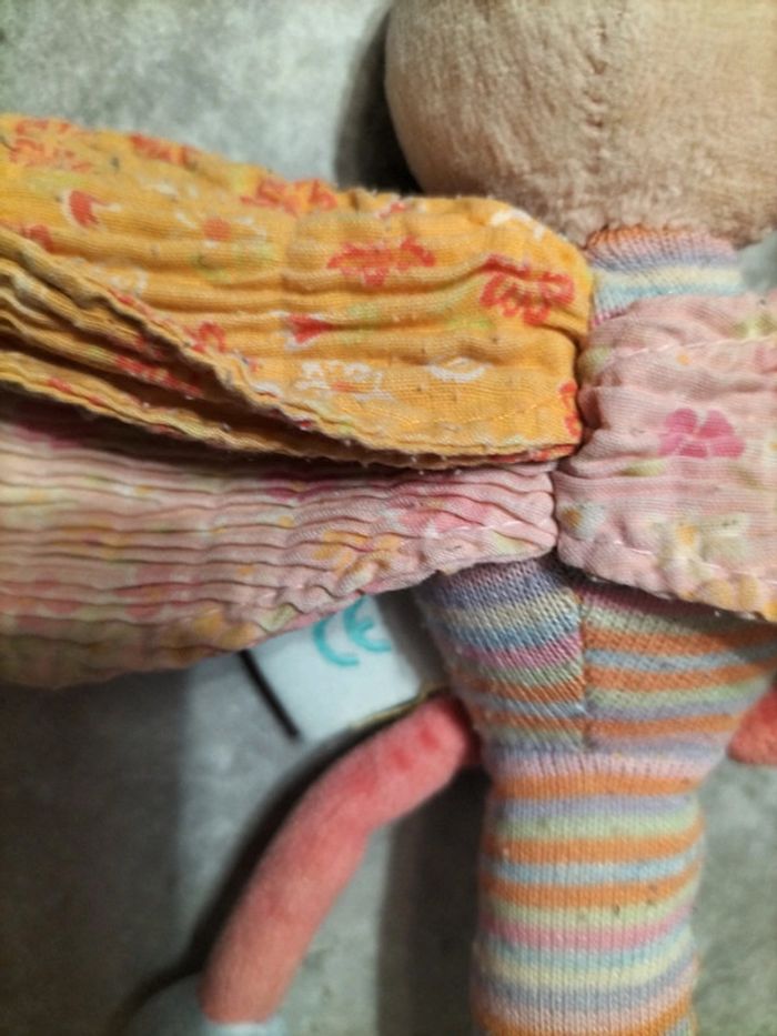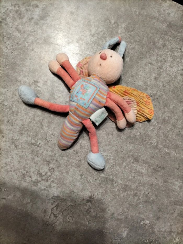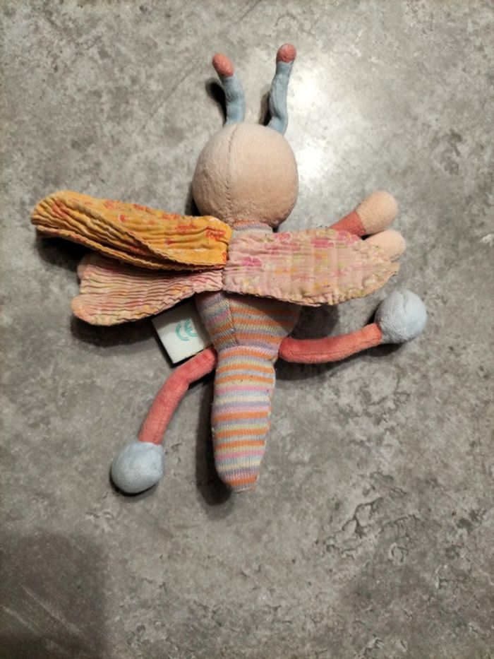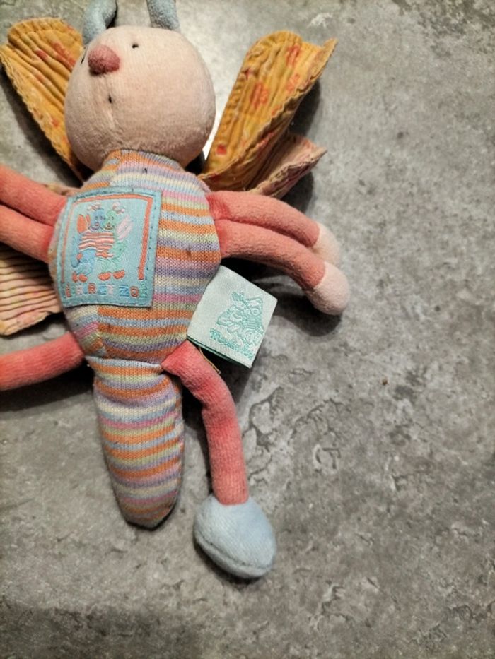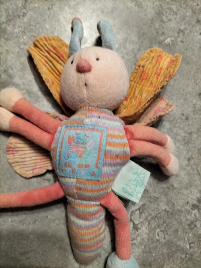 Peluche milles pattes sur les tons oranges bleus quand on la bouge on entend un grelot. #fanfanpeluchebebe@fanfan35320