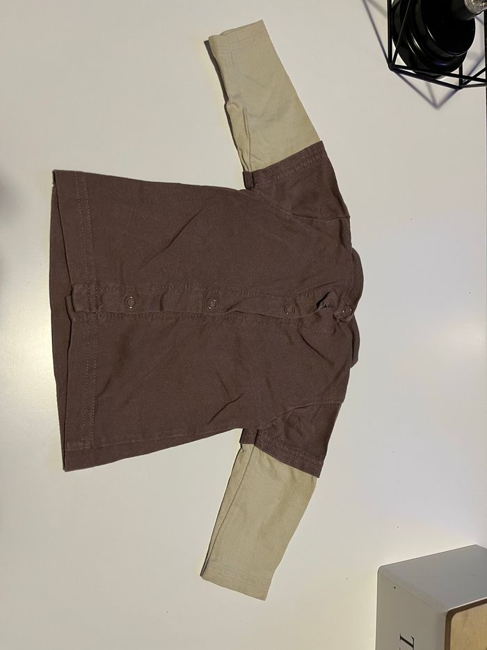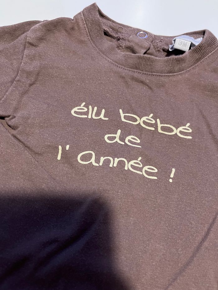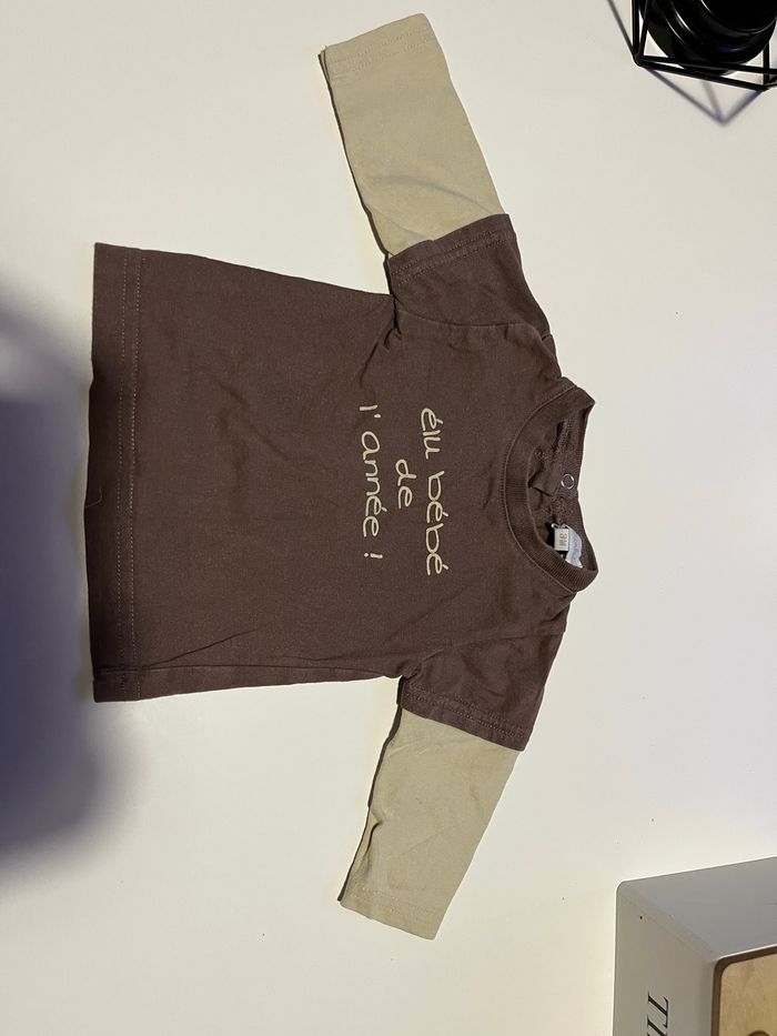 T-shirt a manches longues couleur marron et beige effet t-shirt manches courtes sur t-shirt manches longues écrit élu bébé de l’année sur le devant marque petit kimbaloo taille 3 mois pour plus d’informations ou de photos n’hésitez pas à m’envoyer un message